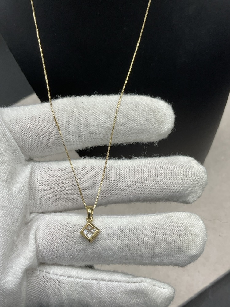 14K Gold Necklace with diamond square pendant with four diamonds.