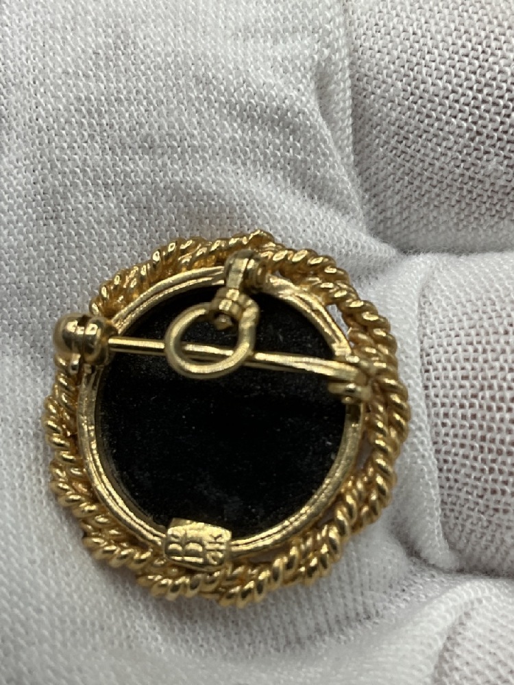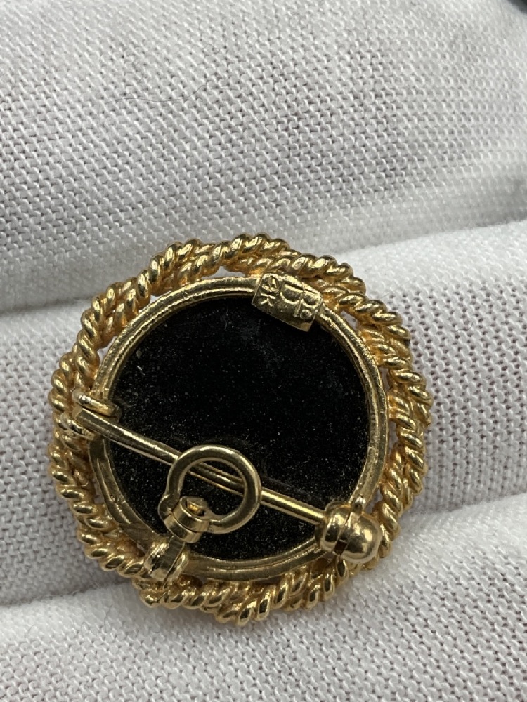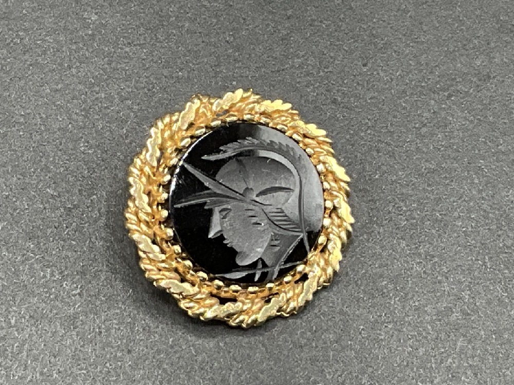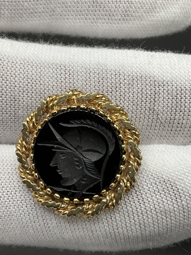 14K Yellow Gold Romanesque carved glass pin or pendant.