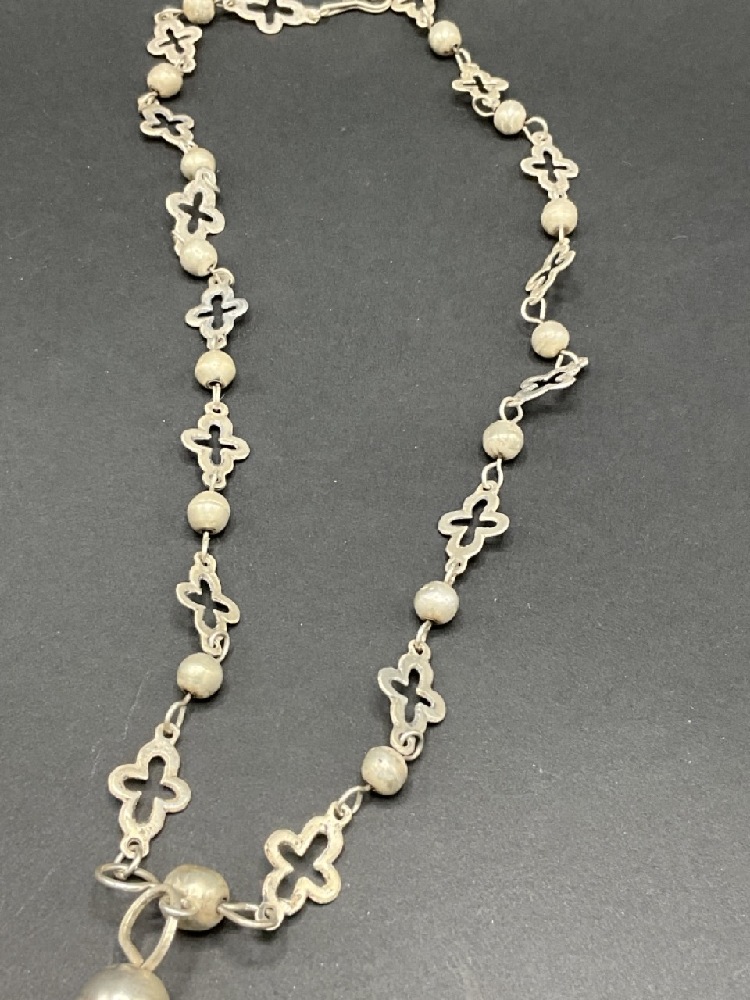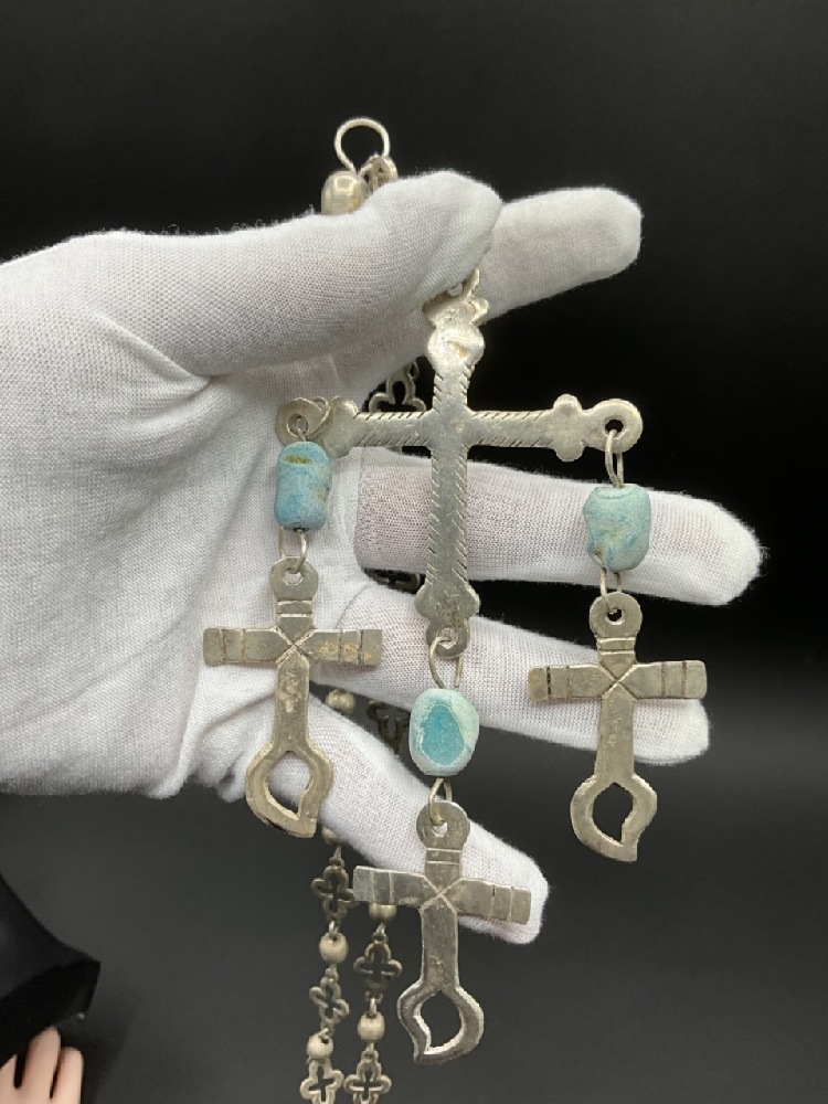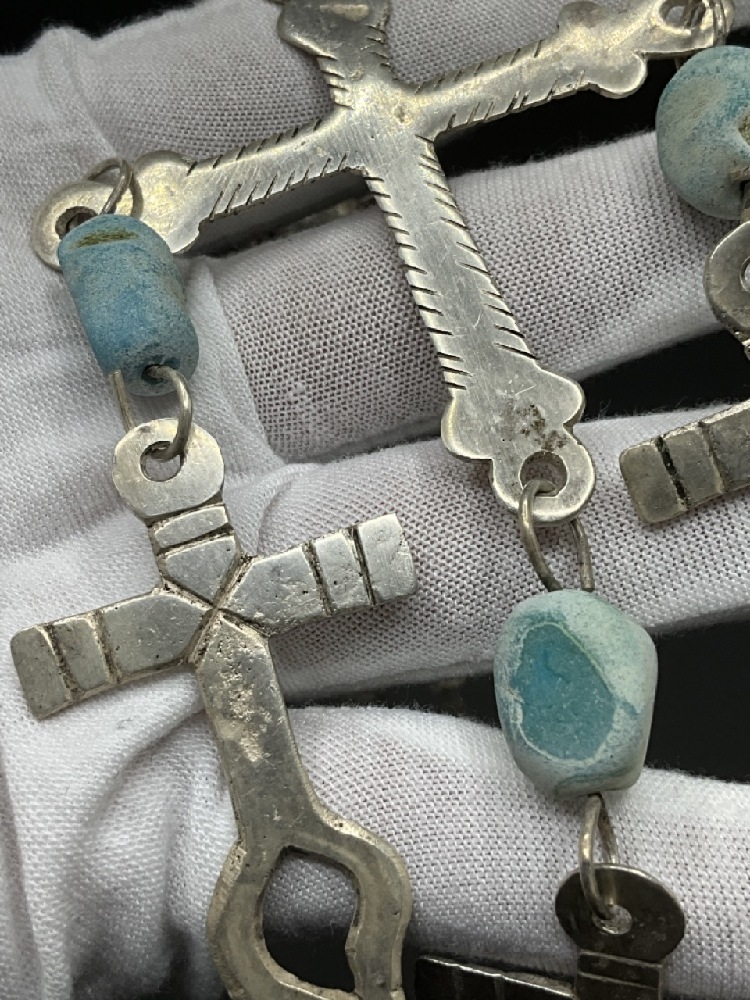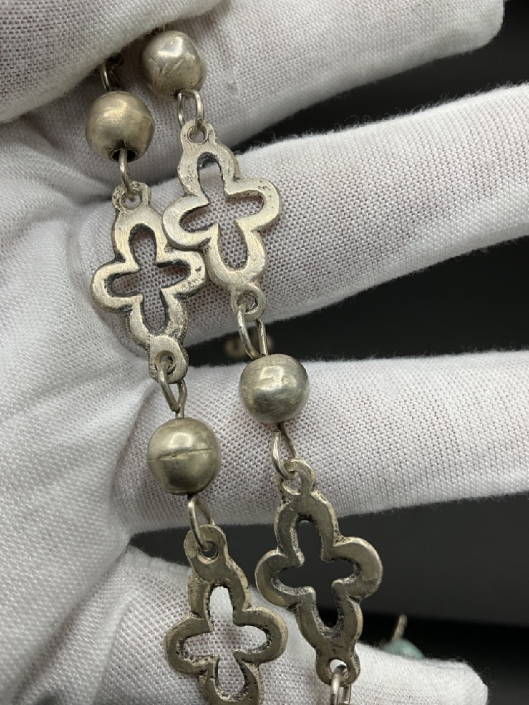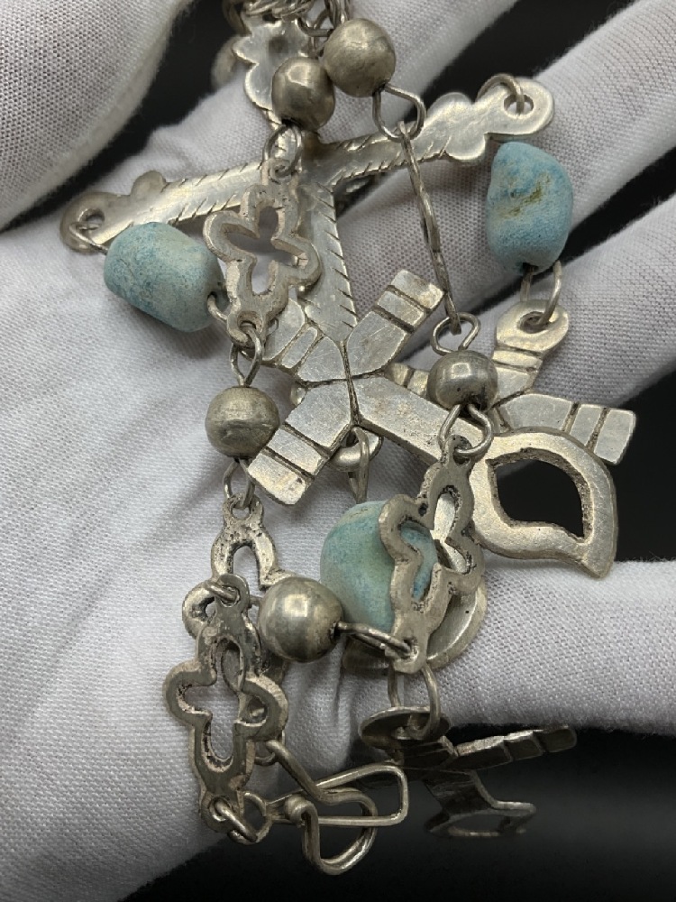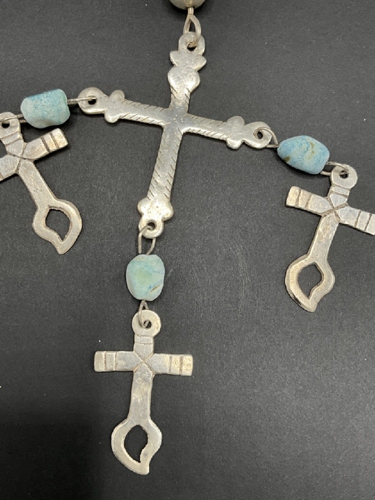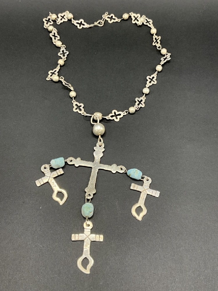 Vintage South American Silver Cross Necklace with Turquoise. Primitive in design. Unsigned, tested silver .900 or better.