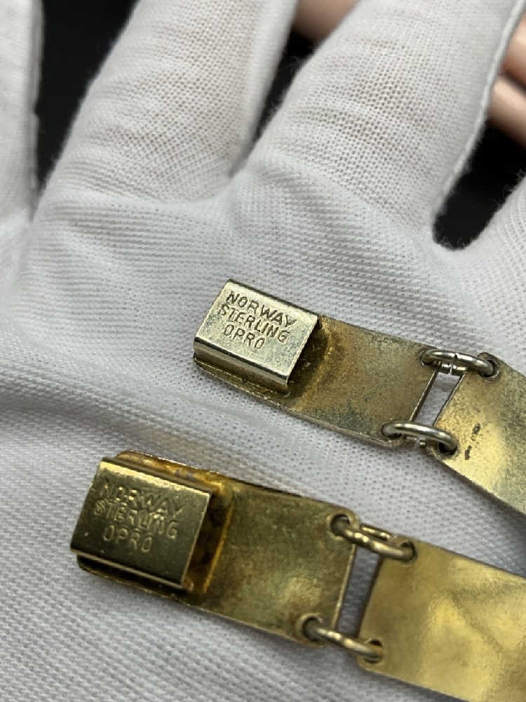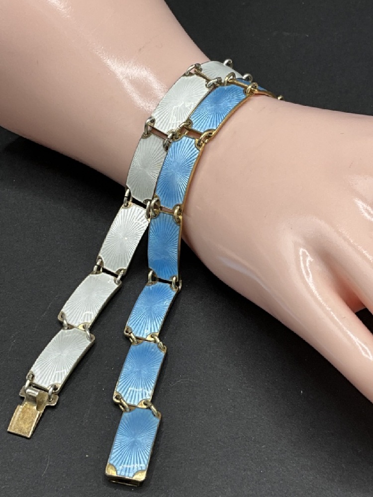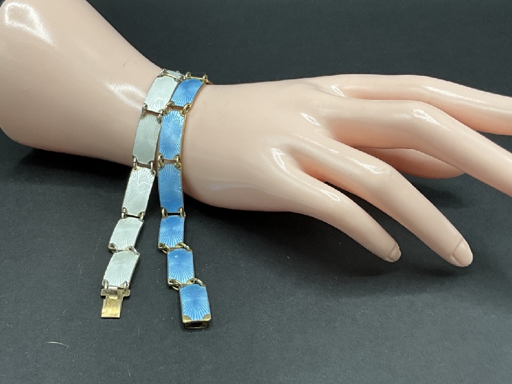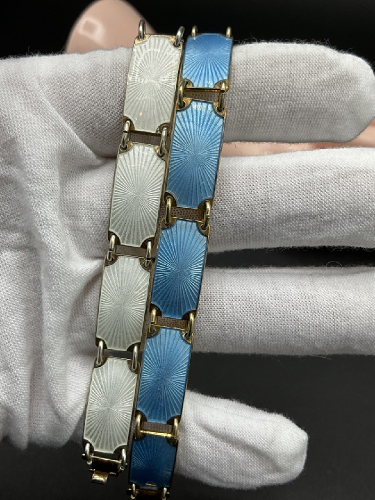 Two (2) Opro sterling silver bracelets. White enamel and blue enamel bracelet.