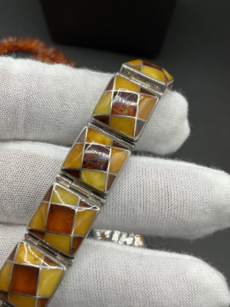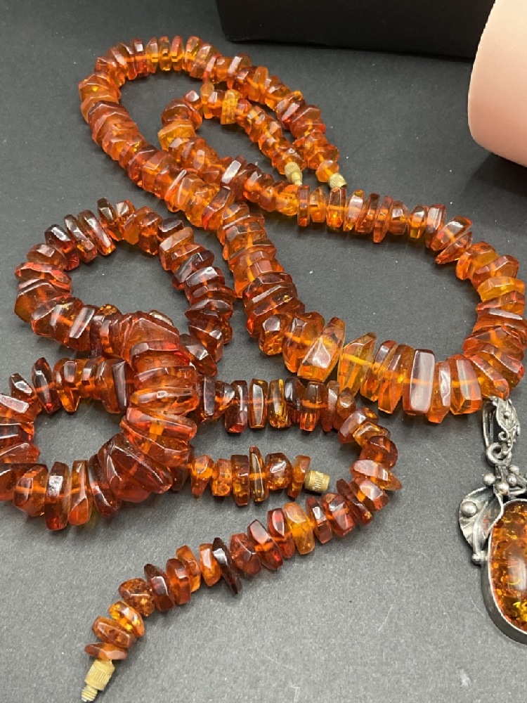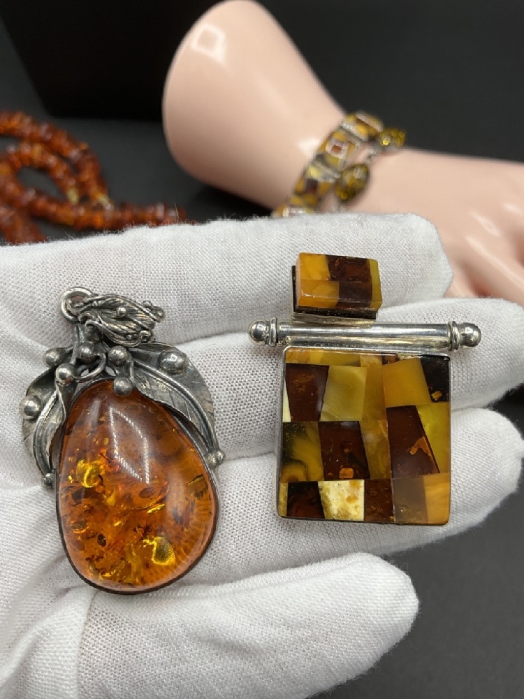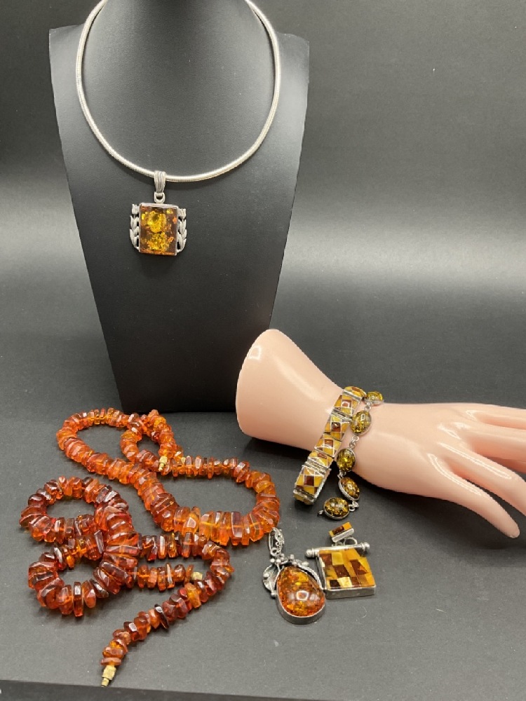 Estate compiled sterling silver and amber jewelry. Fine amber pendants, bracelets and strands. As seen in photograph preview.
