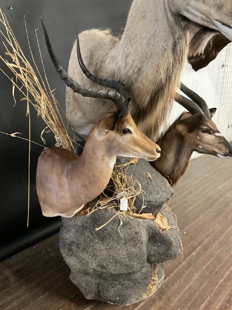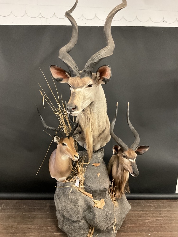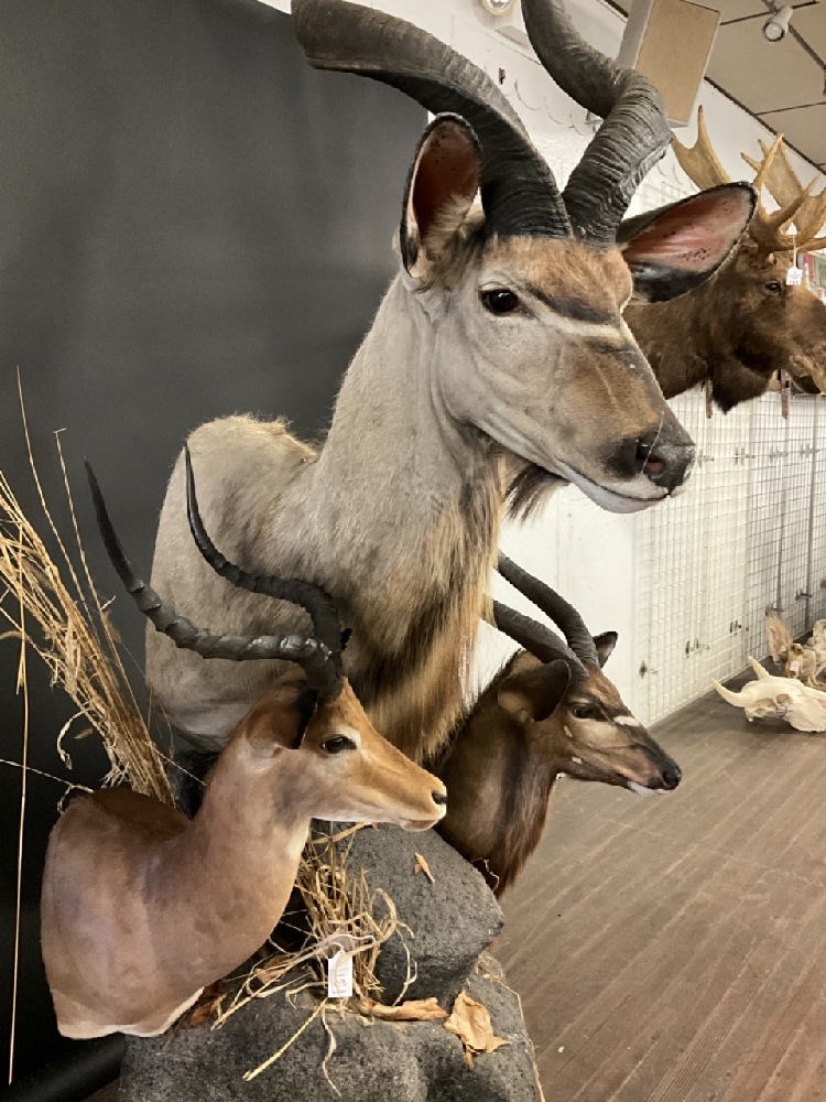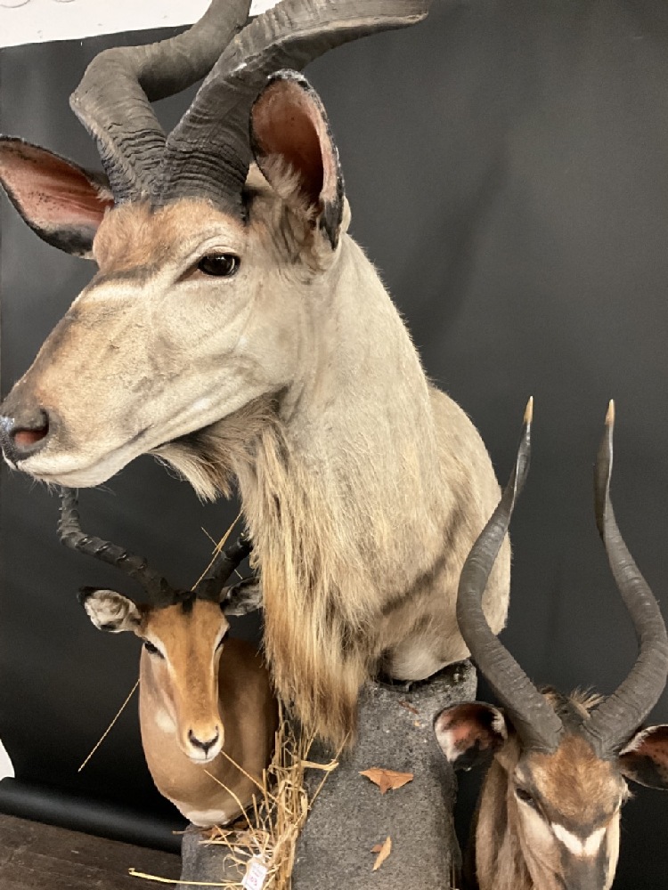 Three (3) African Kudu Taxidermy Mounts. Comes with base and additional stand.
