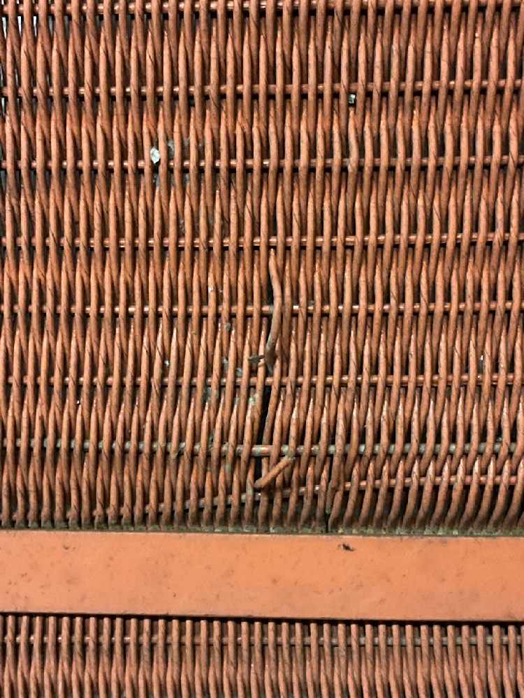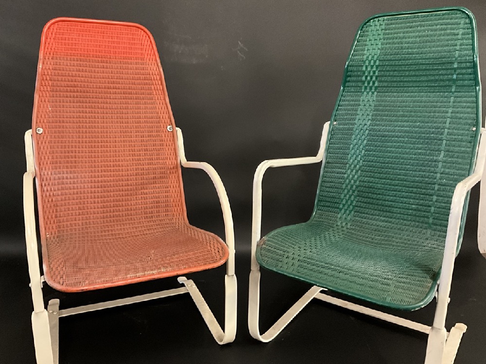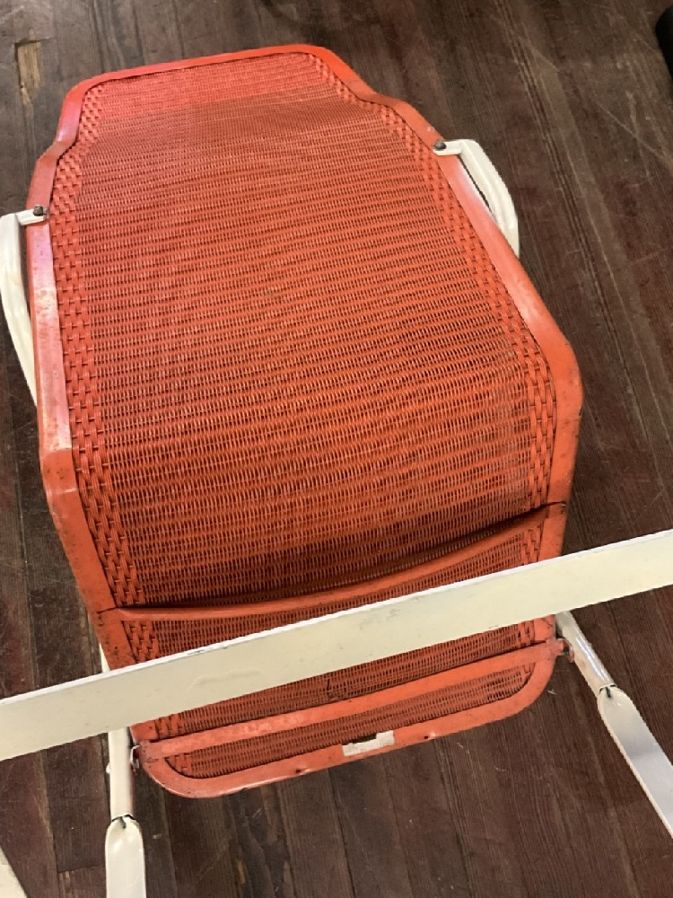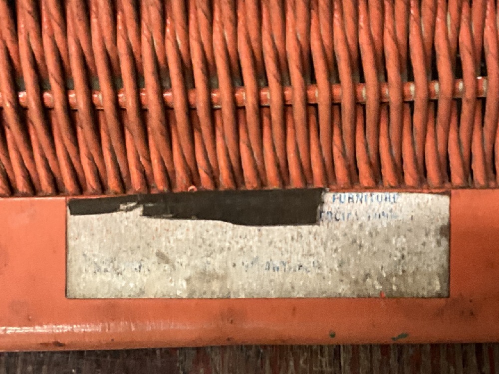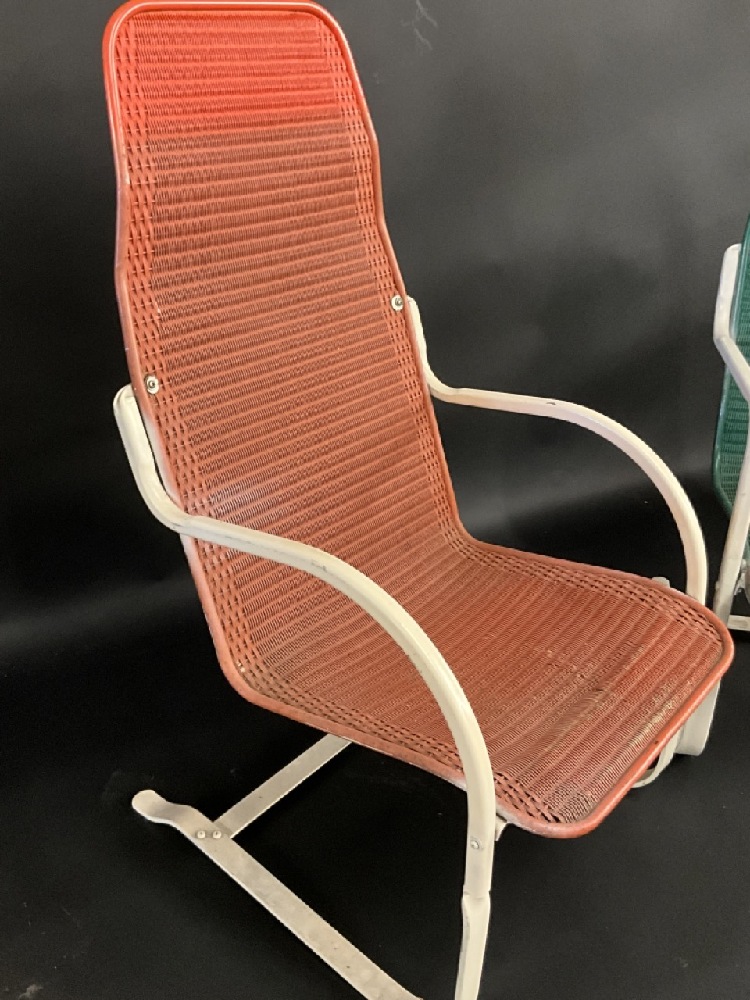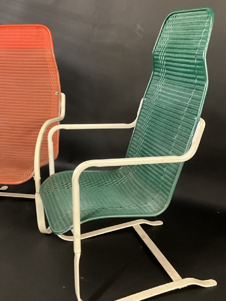 1940's Lloyd Flanders MCM Outdoor Lounge Chairs. Signed at base. Orange chair has small area of loom unraveling.
