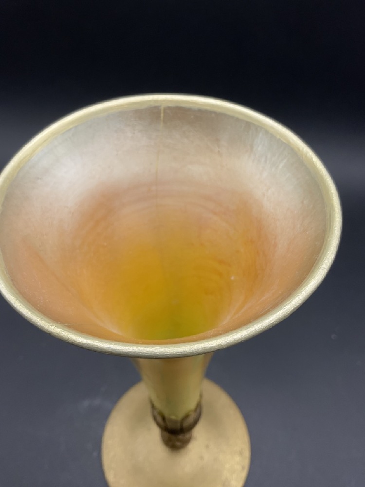 Tiffany Studios New York Favrile glass vase mounted in a bronze base. Signed. Glass is badly damaged and cracked. Please see photograph preview. Dimensions: 12” x 5”