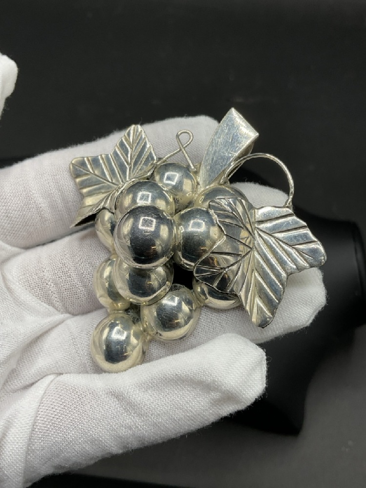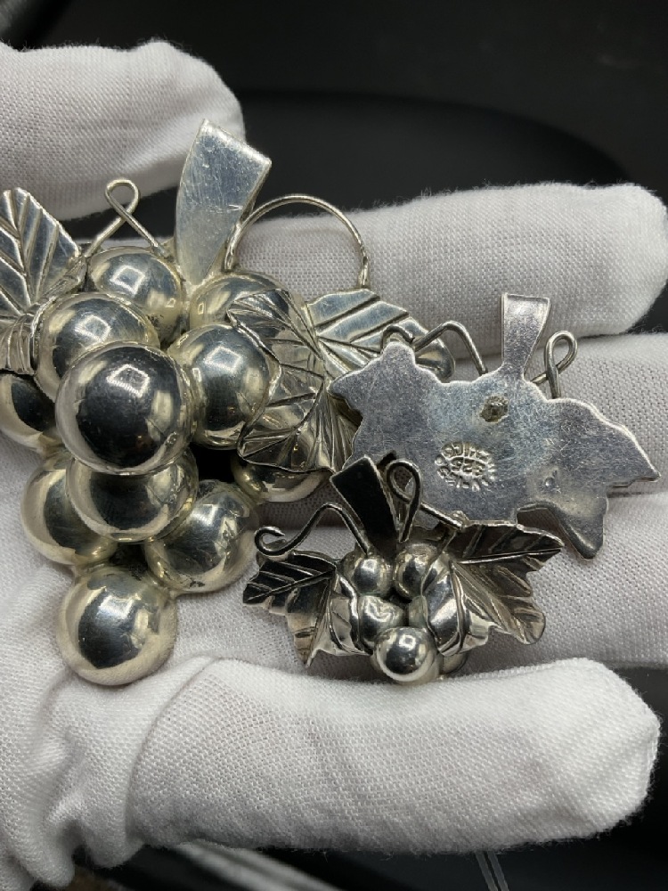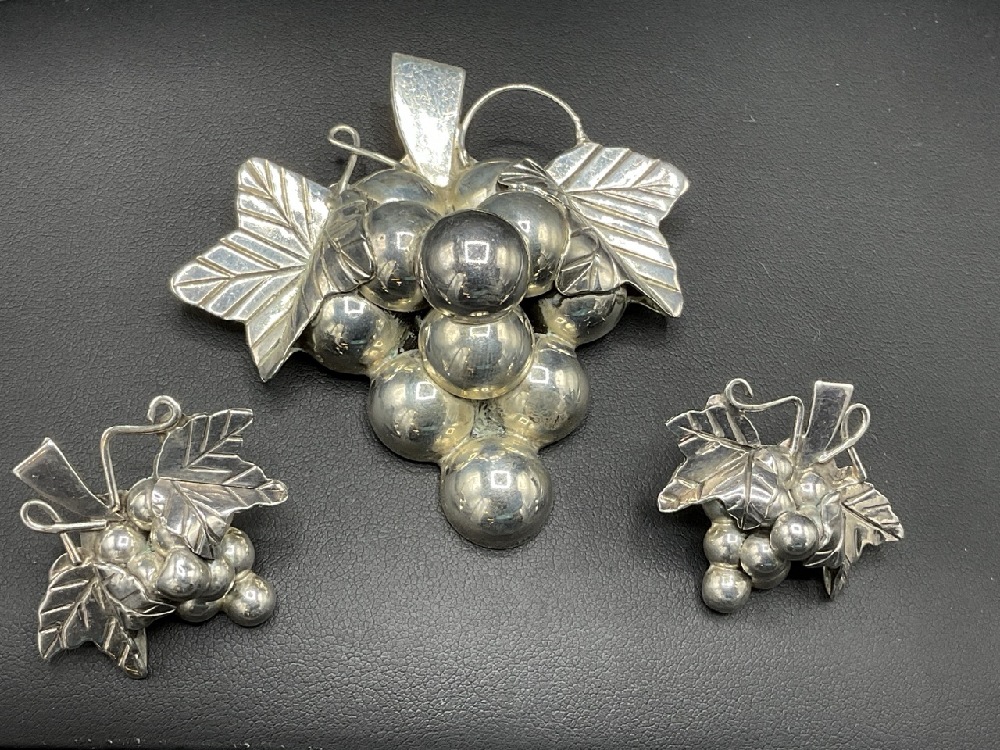 Vintage Mexican Sterling Silver Grape Cluster Brooch or Pendant with matching earrings.