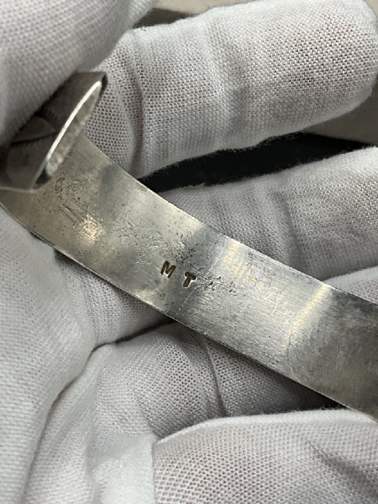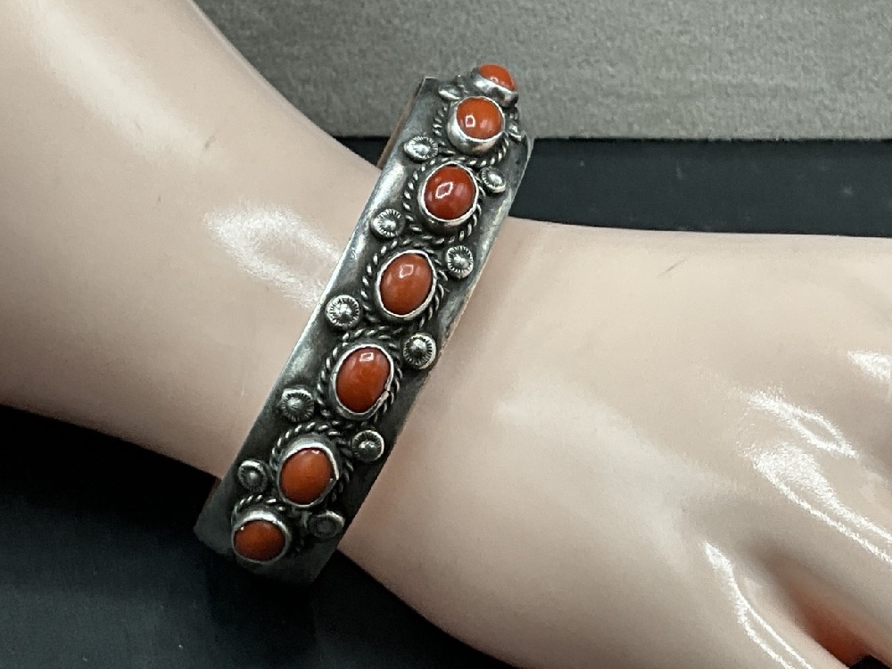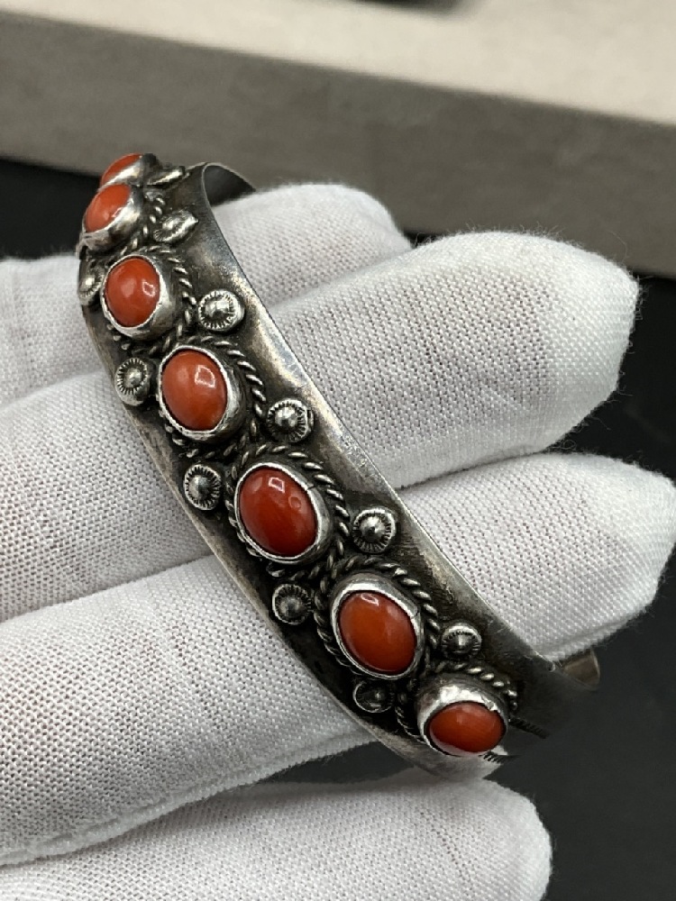 Signed MT Navajo Indian Sterling Silver Cuff Bracelet with Coral Stones.