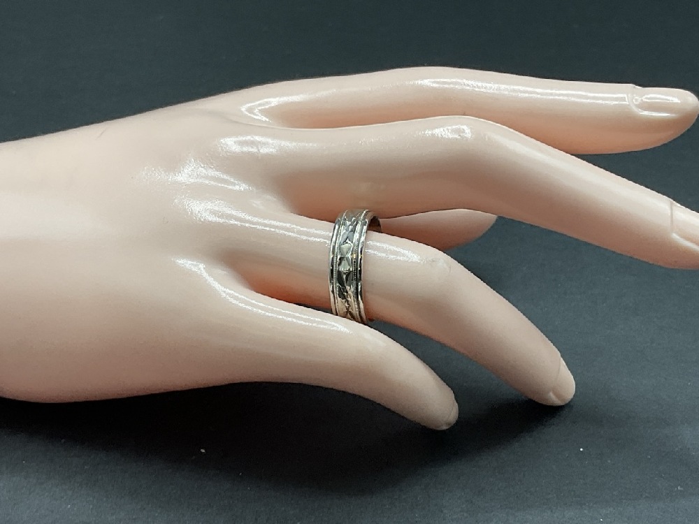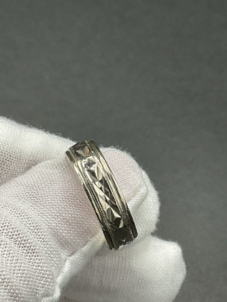 14K White Golld Wedding Band with Bevel Cut Design.