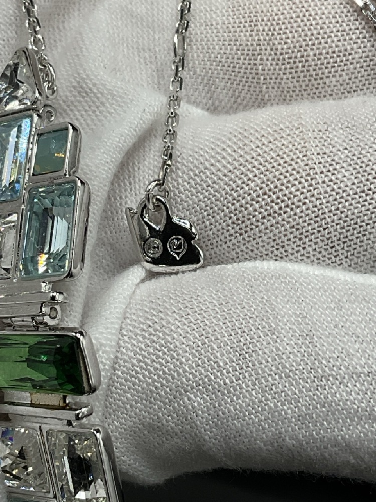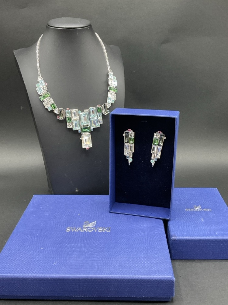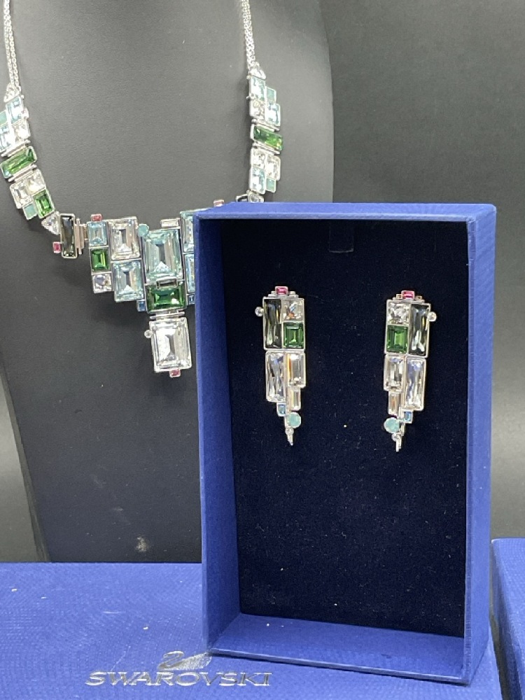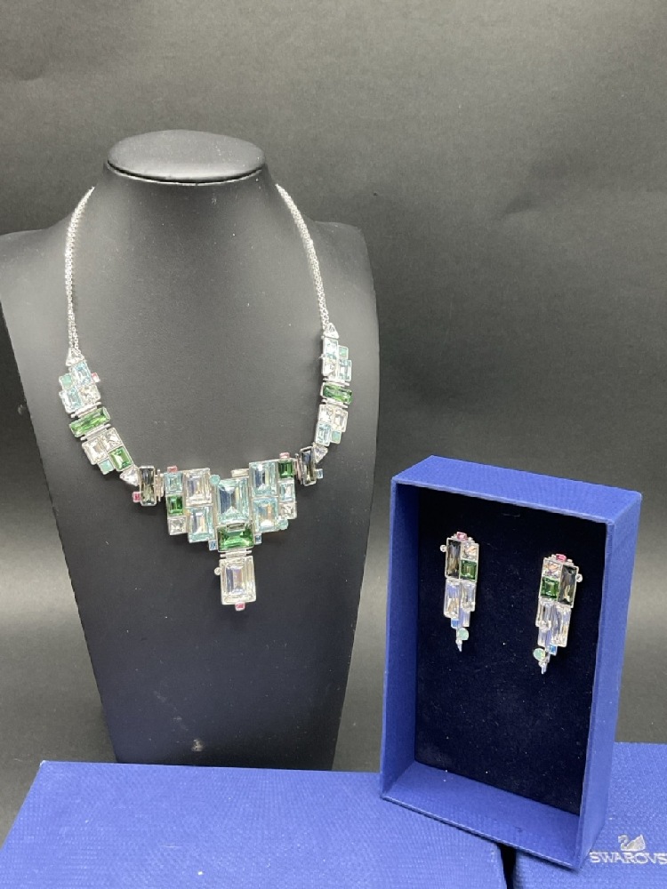 15” Signed. Aqua , Emerald, Rose and Clear Crystals with matching Earrings 2” drop