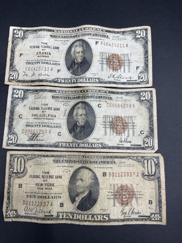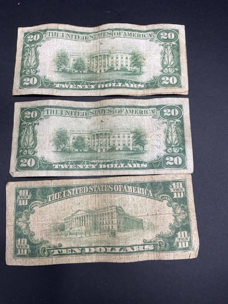 Three (3) 1929 U.S. Bank Note Series $50. Two $20's and $10.