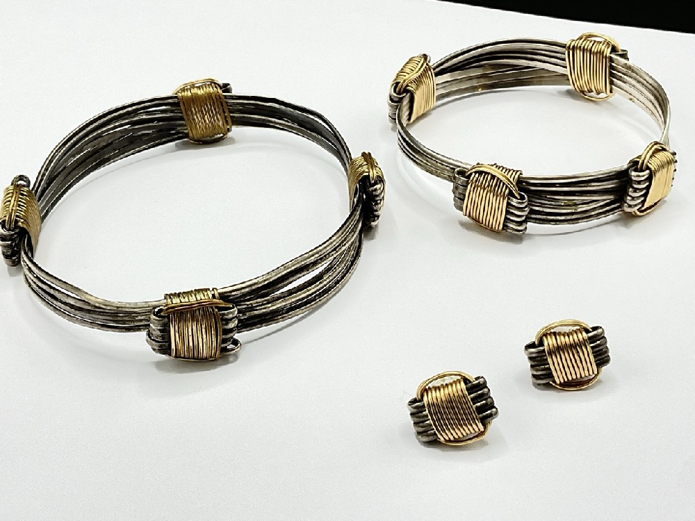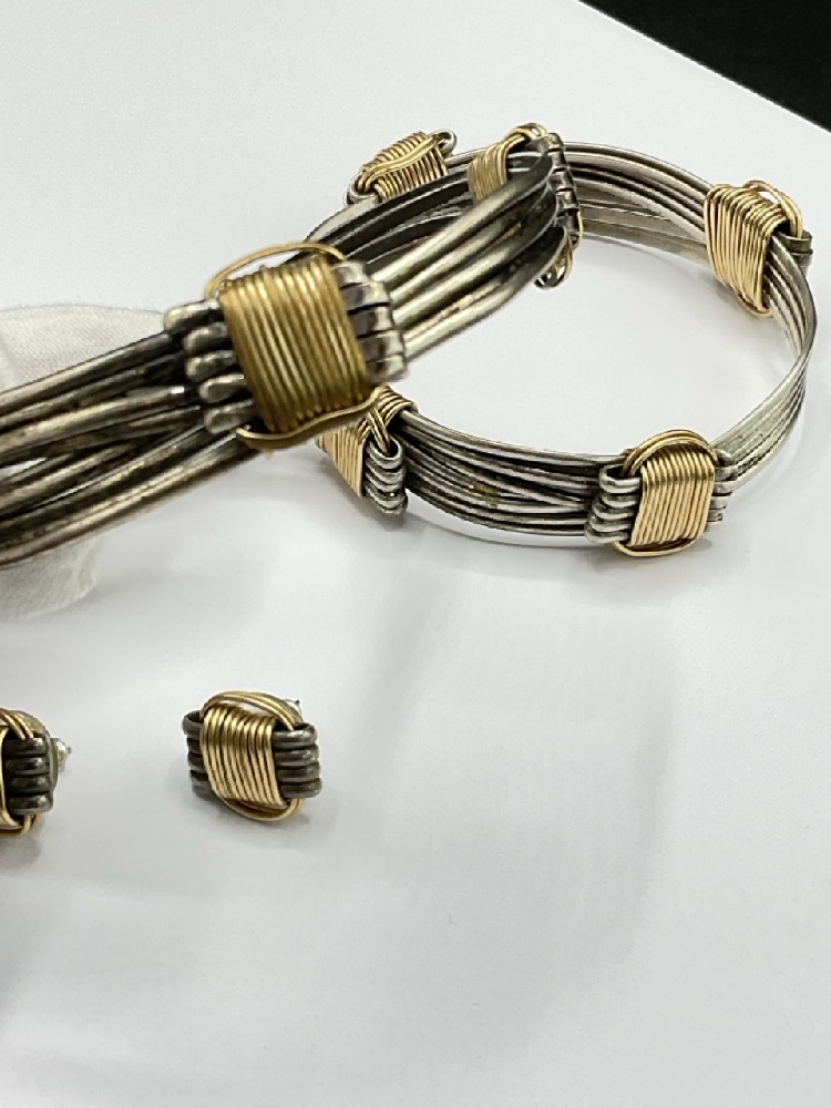 Sterling silver with gold tone Man and Lady's bangle bracelets and matching earrings.