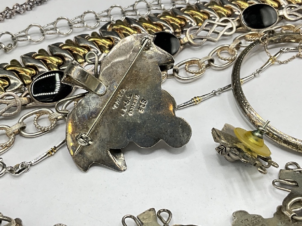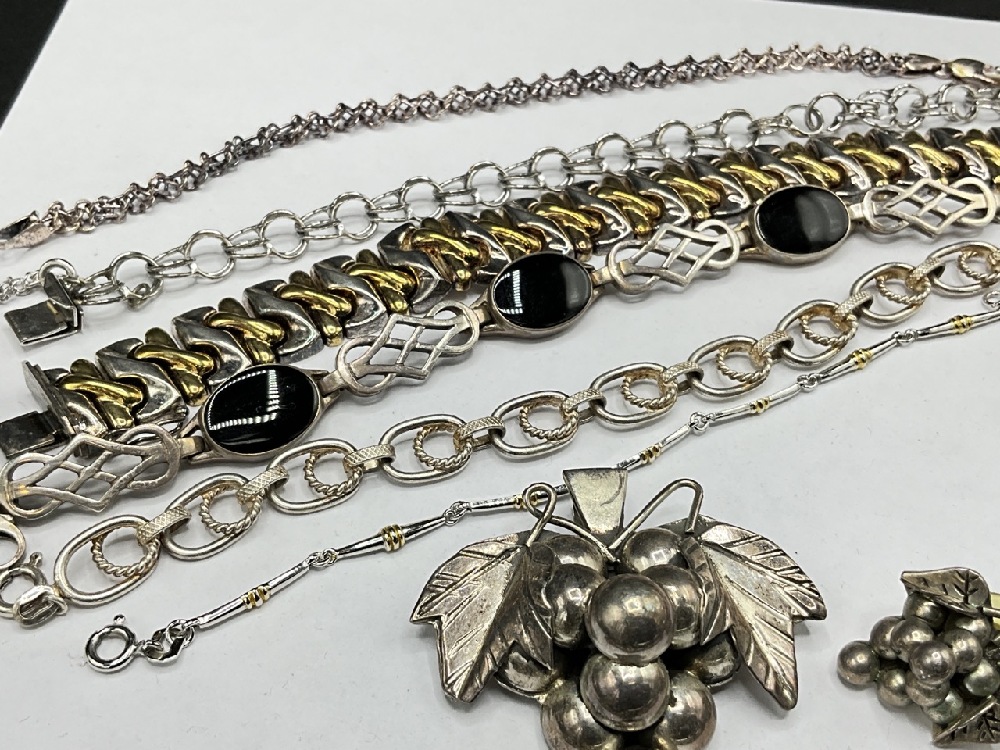 Estate compiled sterling silver jewelry group. Mexican sterling grape cluster set and several bracelets. As seen in photograph preview.