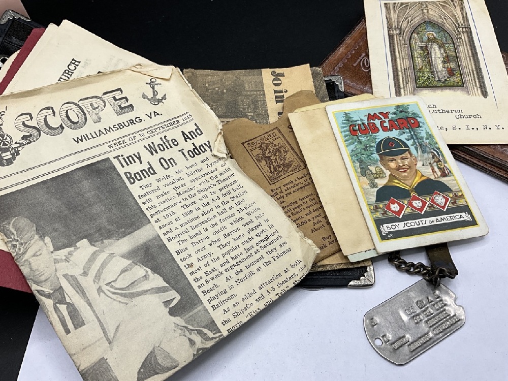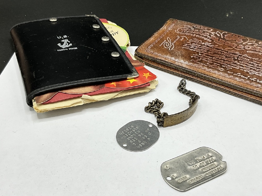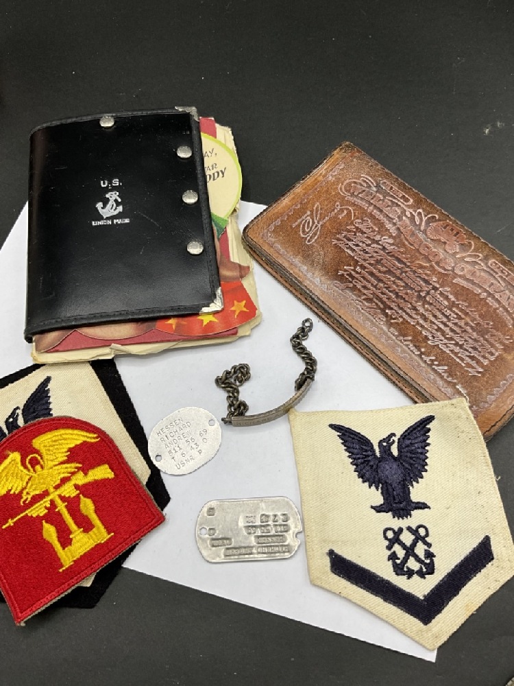 Estate Compiled WWII and Related NAVY Ephemera. Patches, dog tags, sterling ID bracelet, Boy Scouts and Wells Fargo Wallet etc.