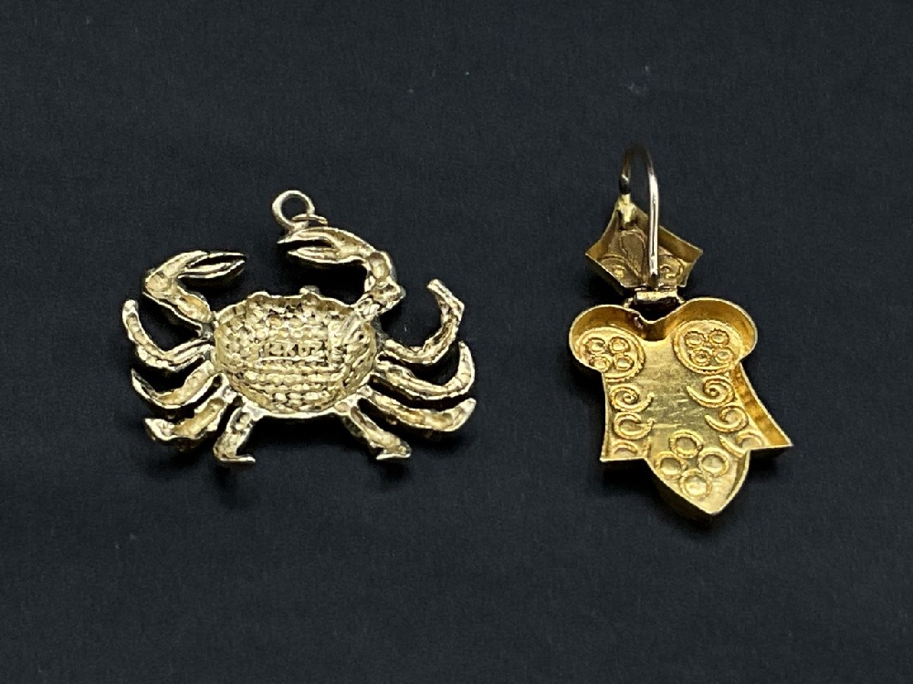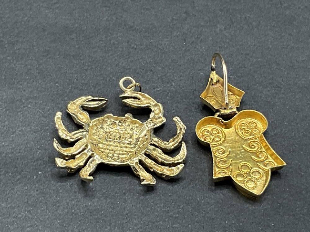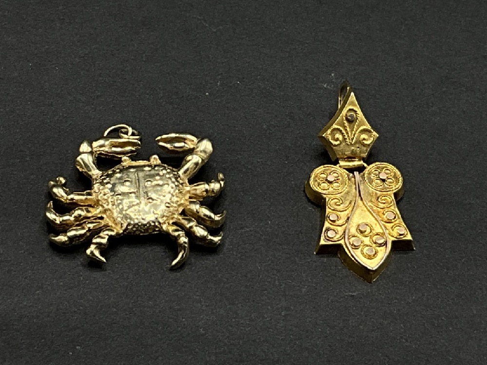 Two (2) 14K yellow gold pendants. One crab charm style and European style pendant.