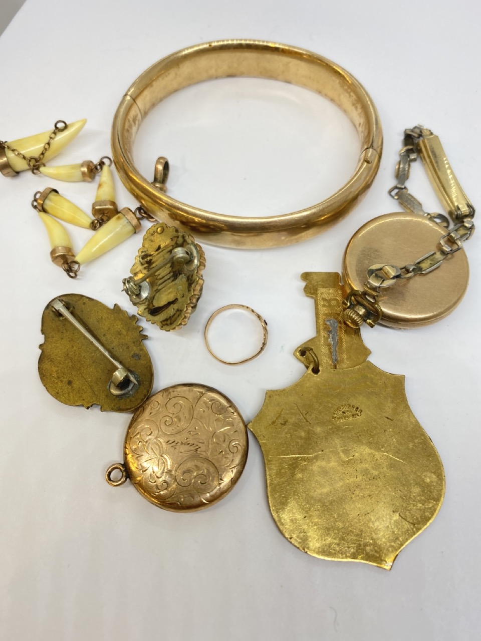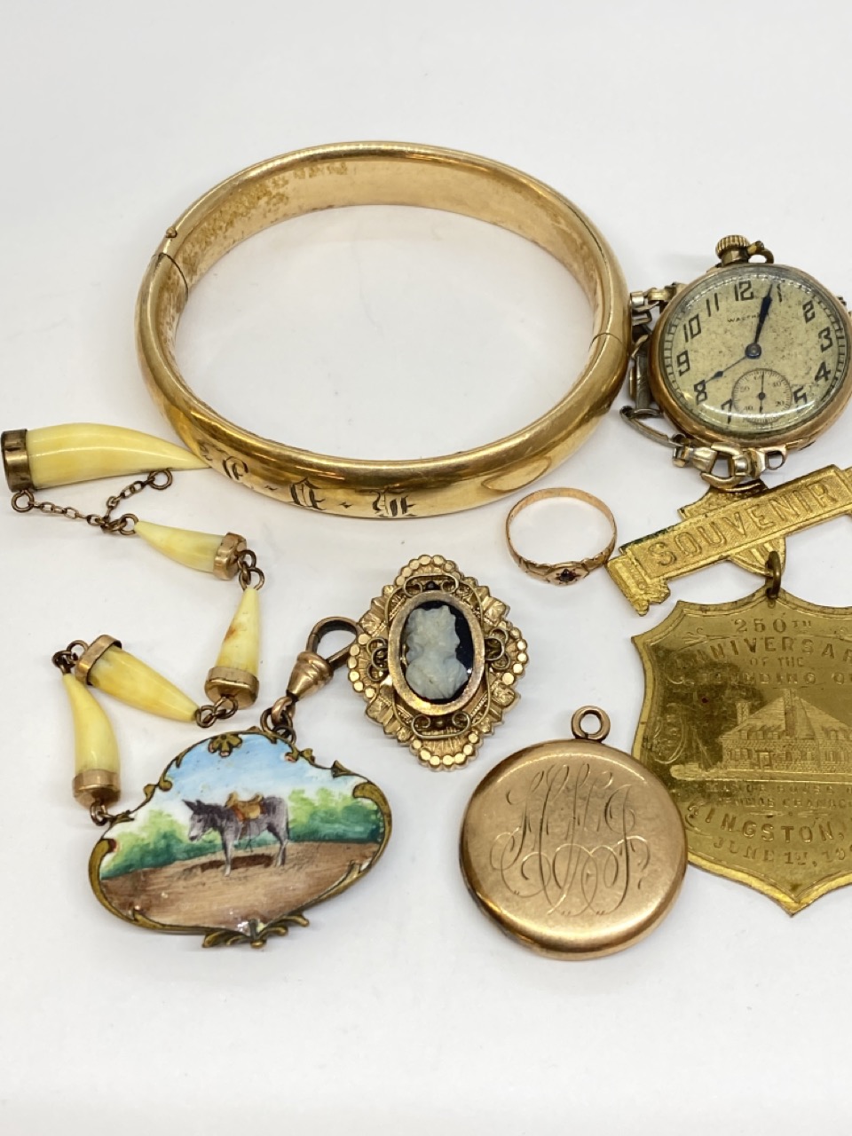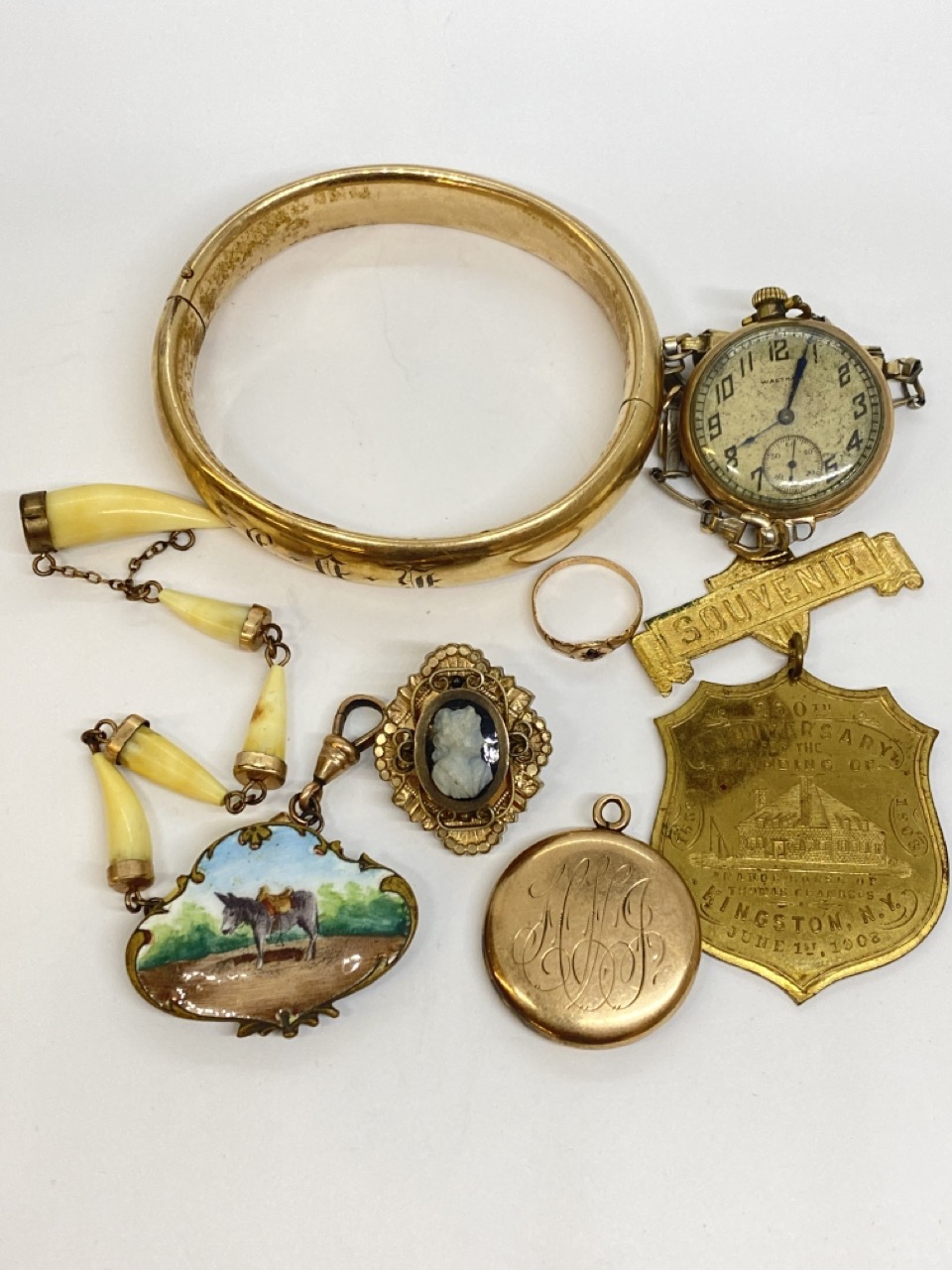 Eight piece Victorian jewelry grouping including Victorian cameo hand painted pin, 250th anniversary of the founding of Kingston New York c.1908 a 10k gold locket ,Waltham ladies wristwatch and Victorian era horn watch fob.