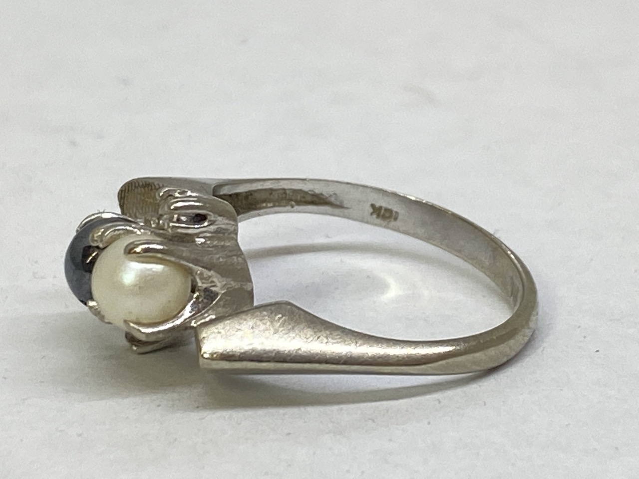 10k white gold ring with two pearl stones.