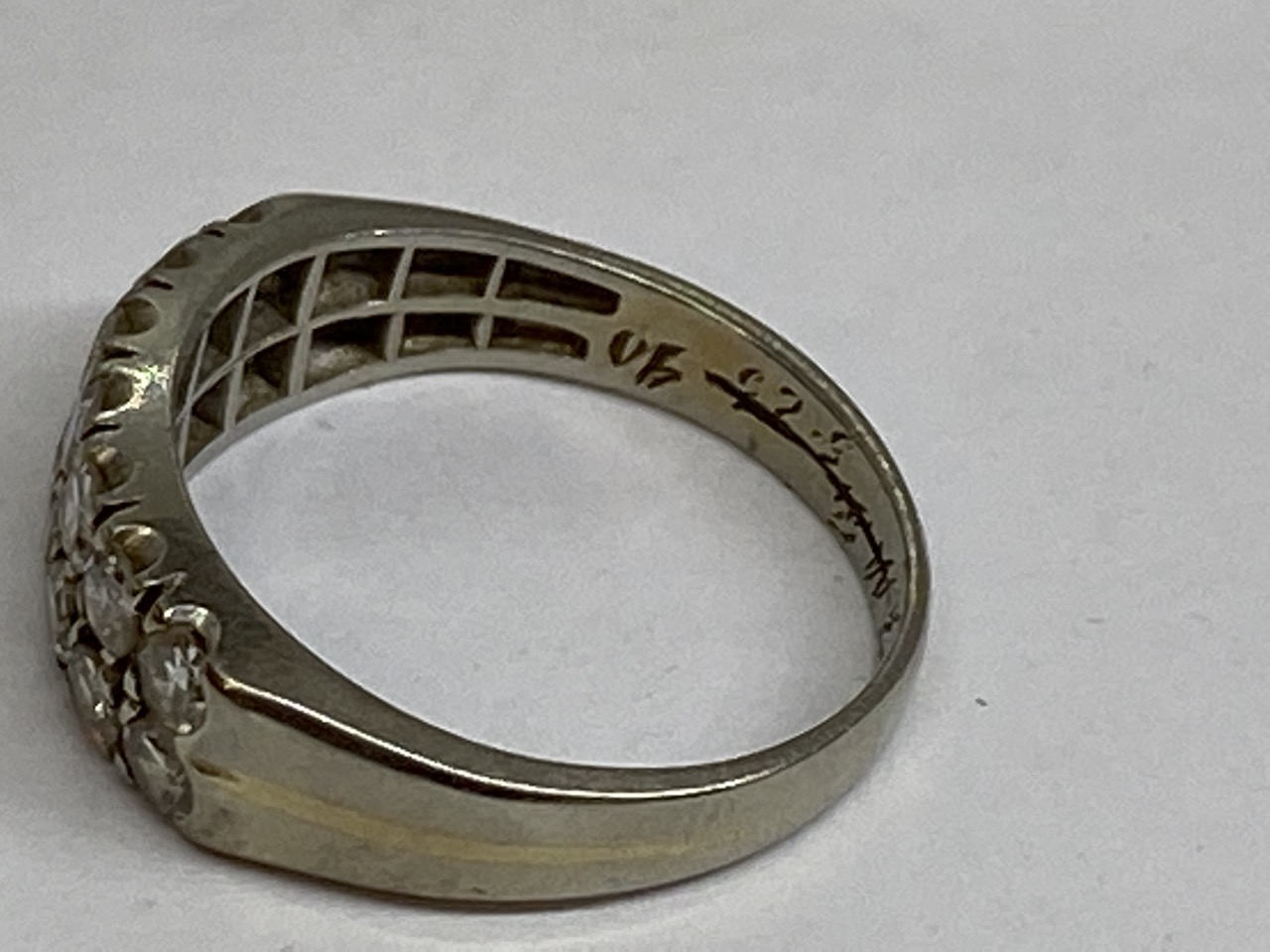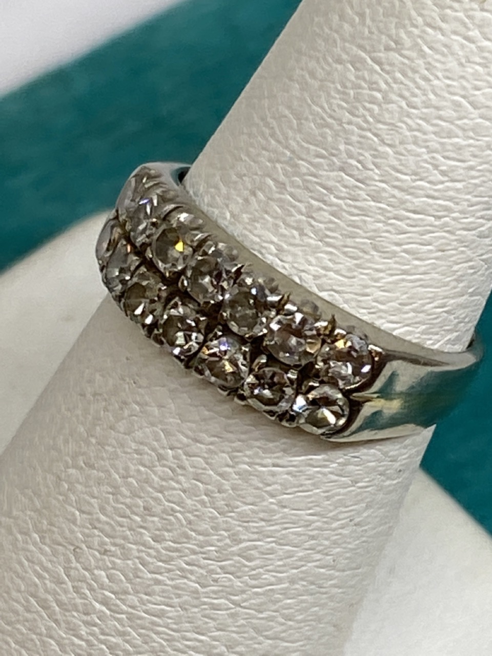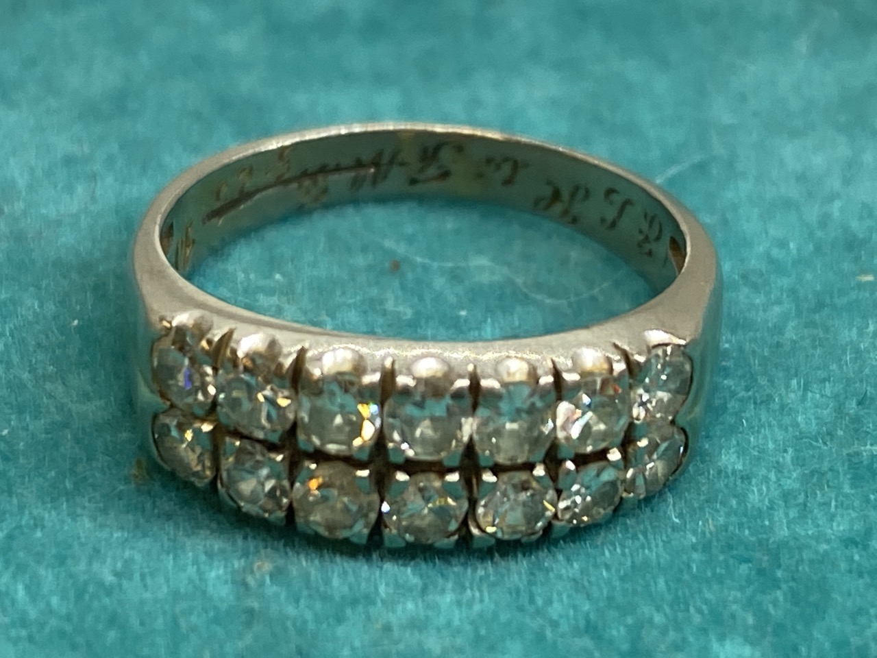 14k gold diamond double stacked band with fourteen diamonds.