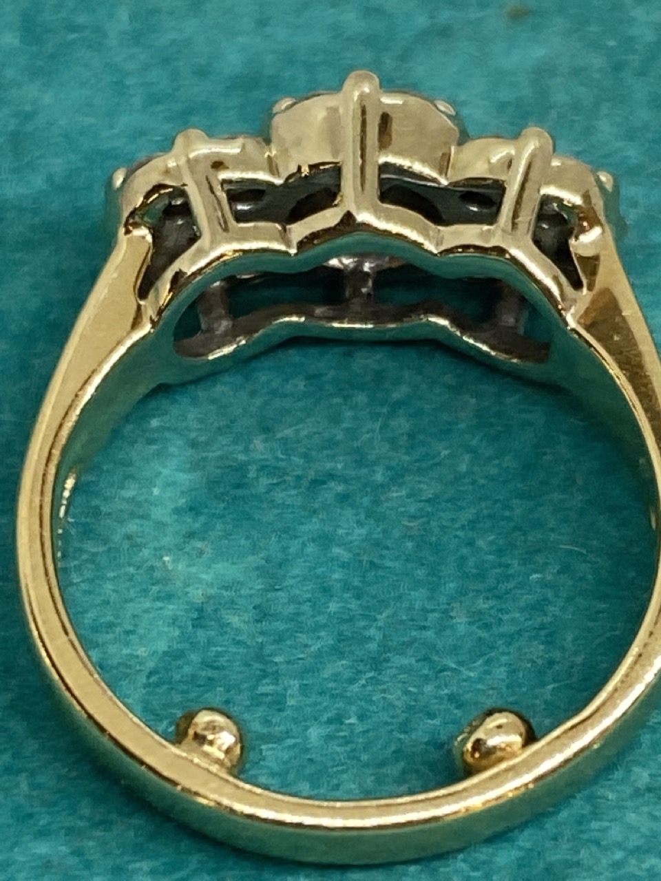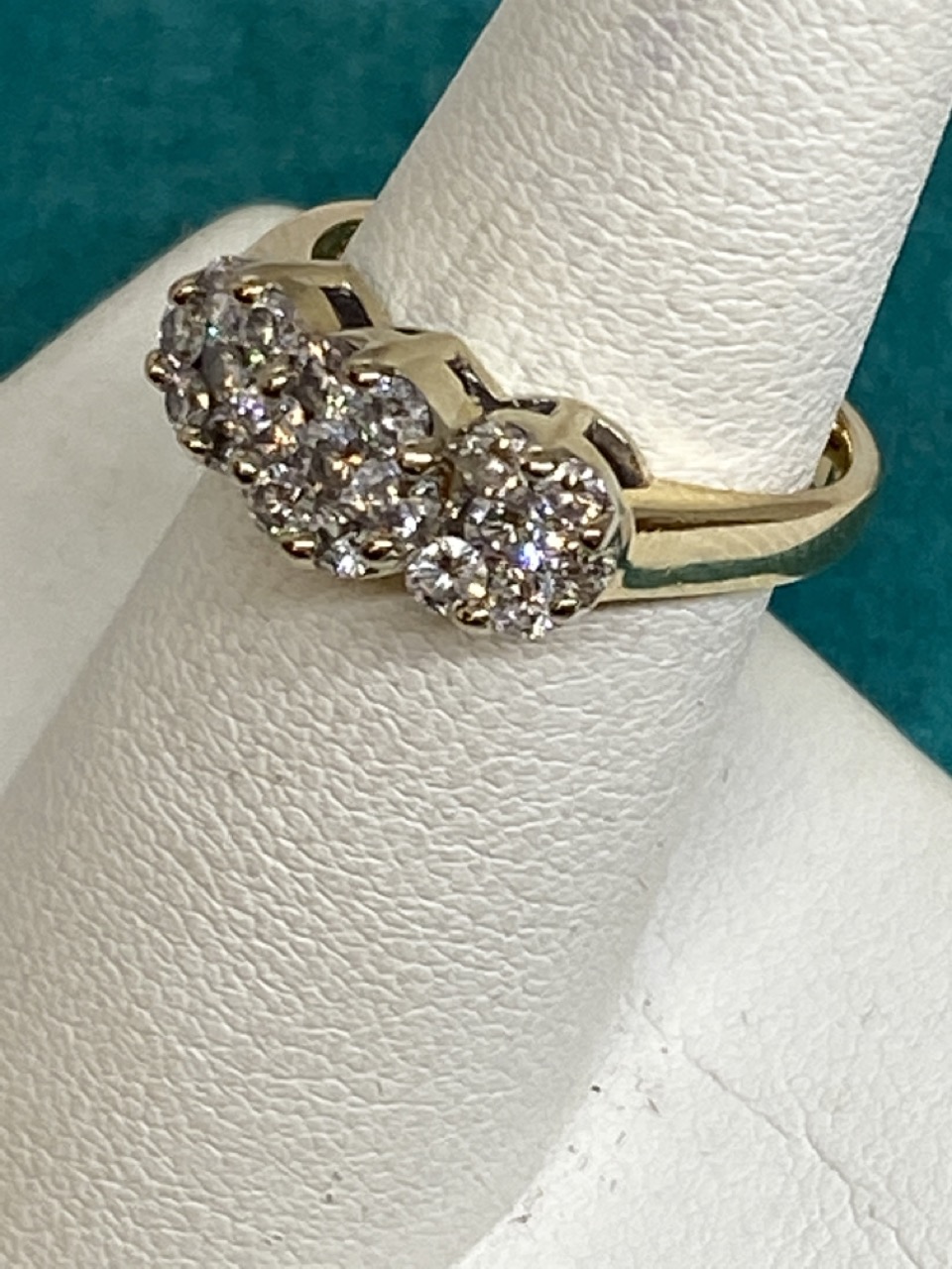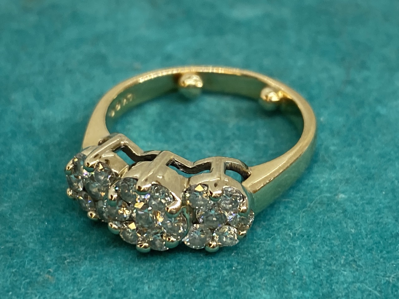 14k yellow gold Past, Present, Future diamond ring with twenty one round diamonds.