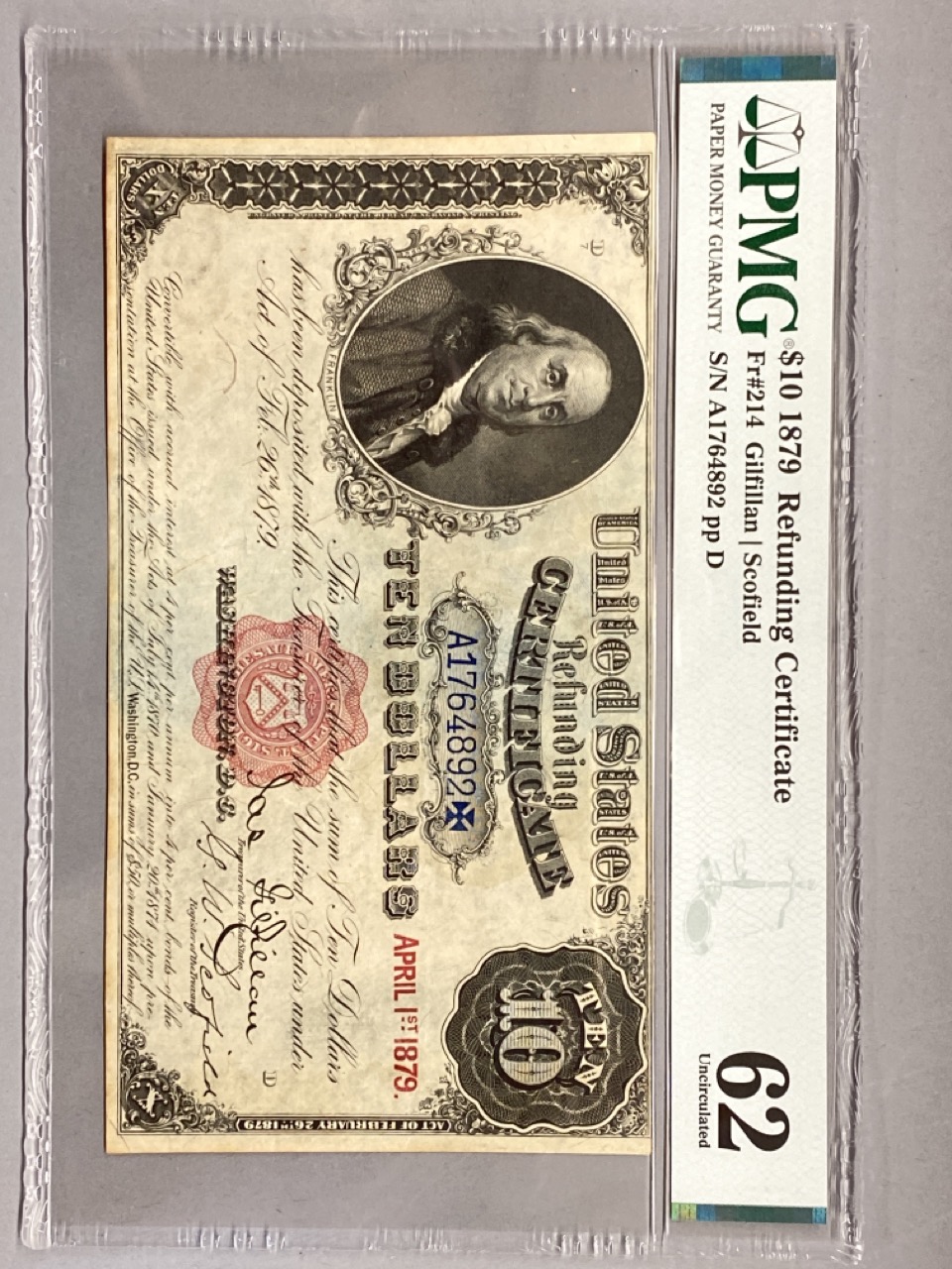 $10 1879 Refunding Certificate PMG 62 Uncirculated.