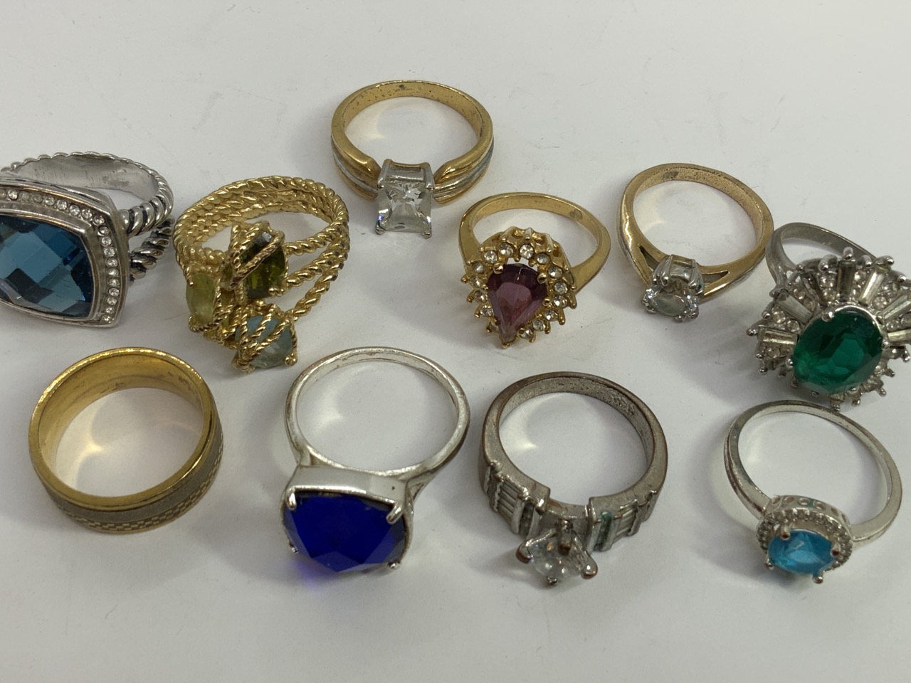 Ten piece assorted costume jewelry rings lot.