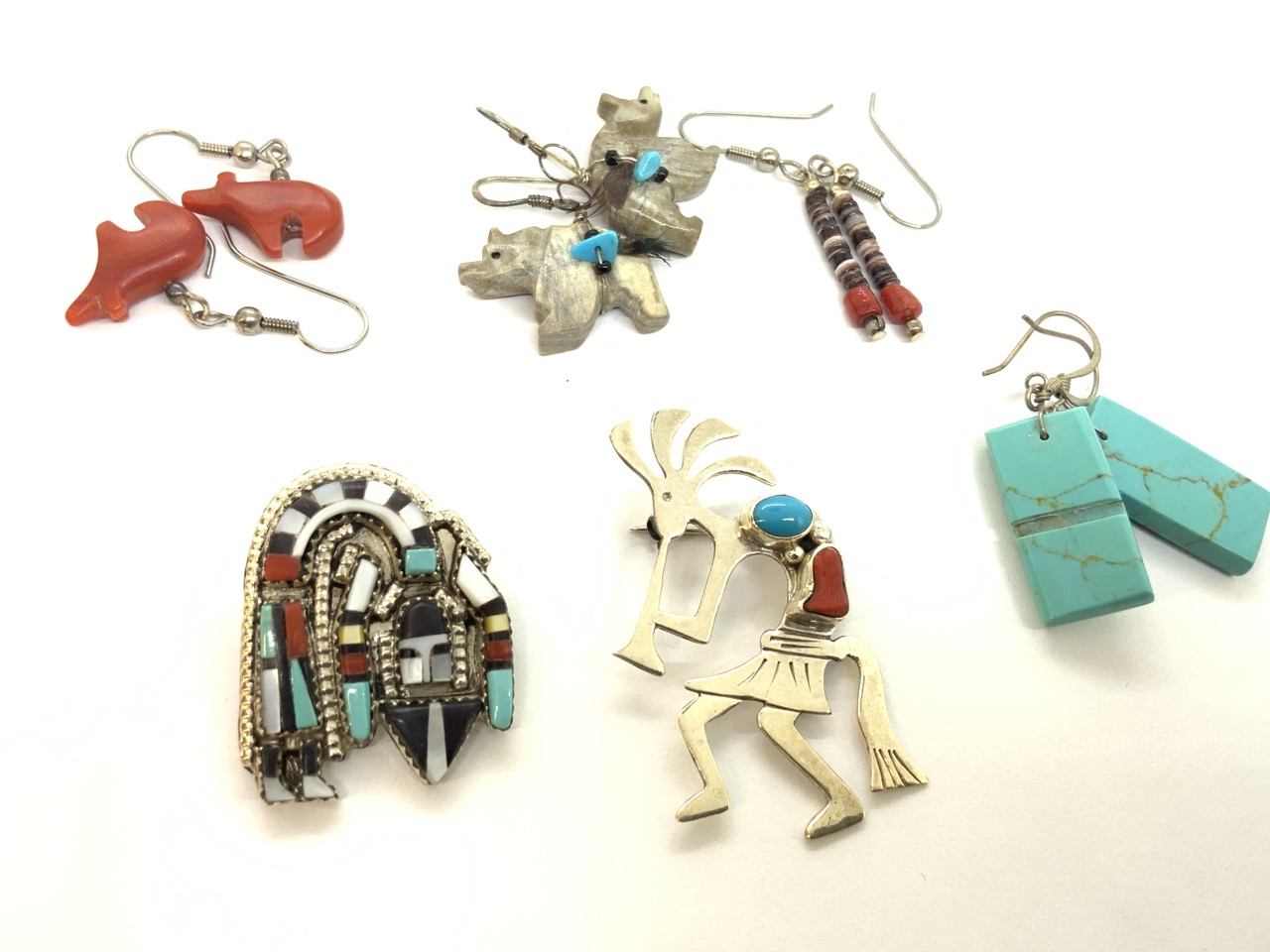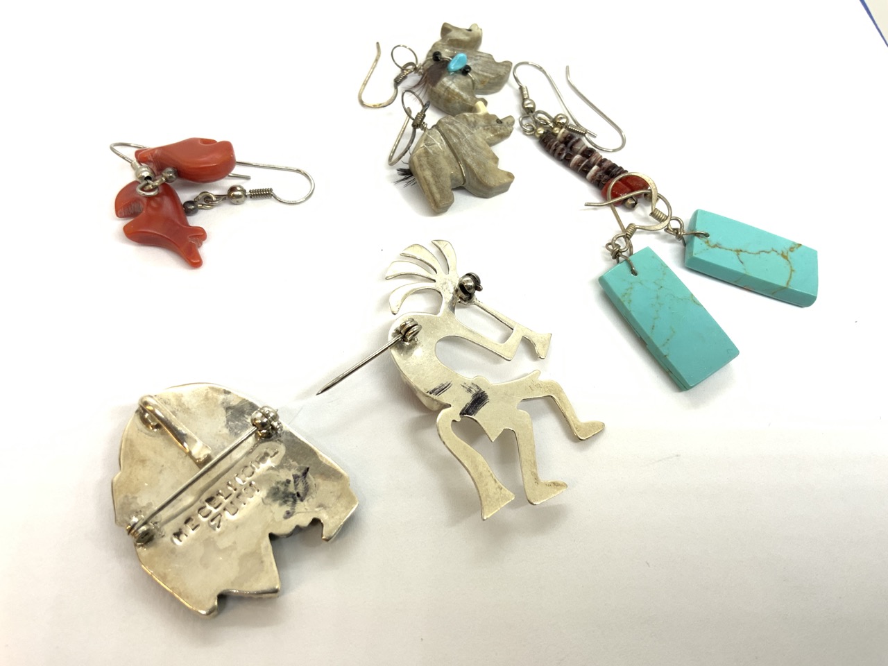 American Indian sterling silver jewelry group including two pins and earrings.