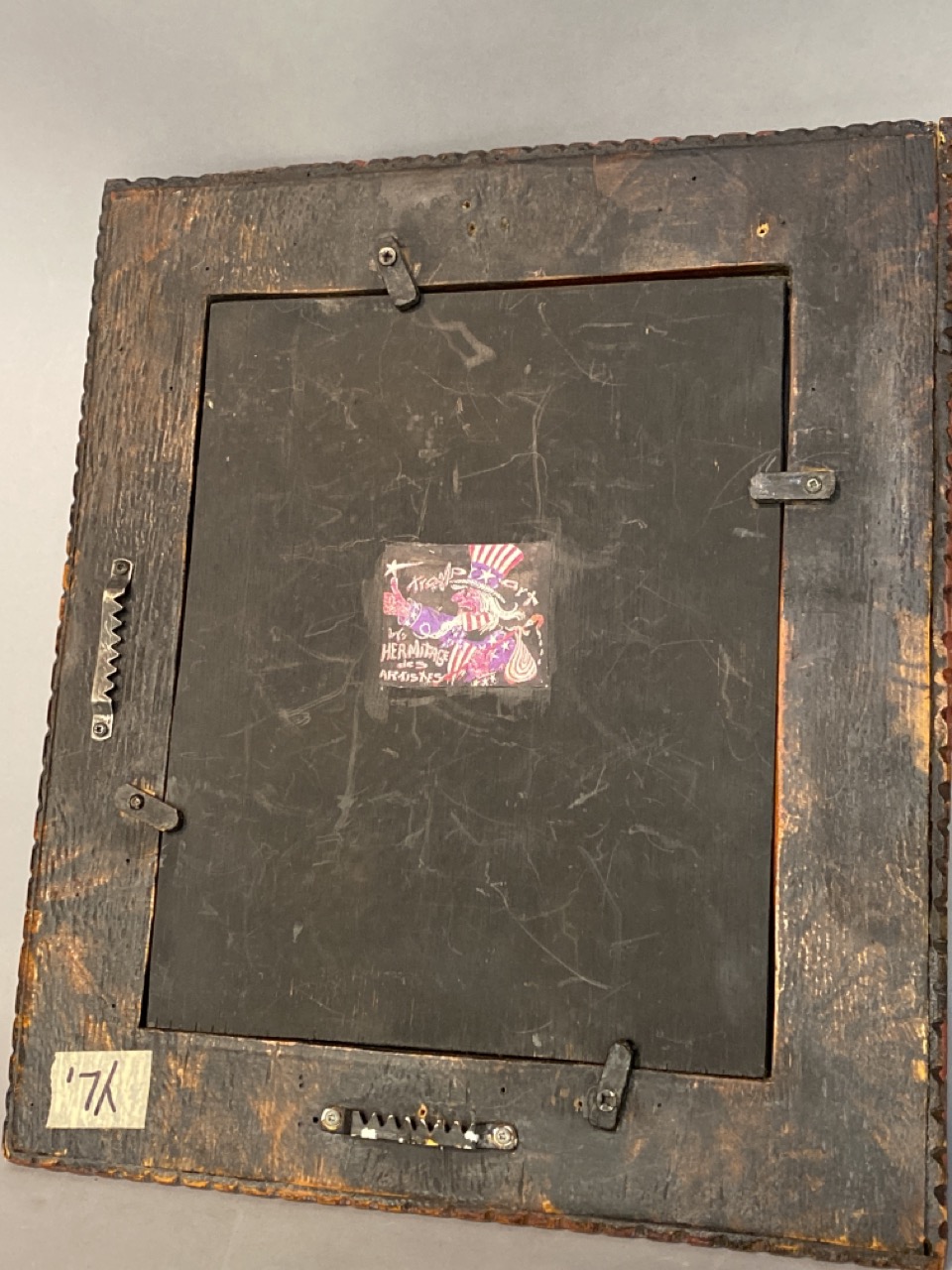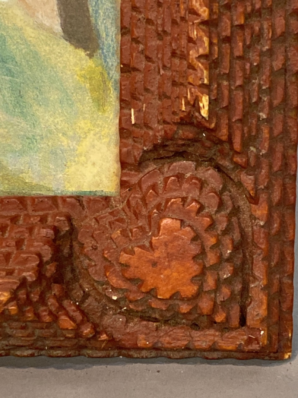 Michael Lavery Folk Art Heart Tramp art frame with female portrait oil paintings.