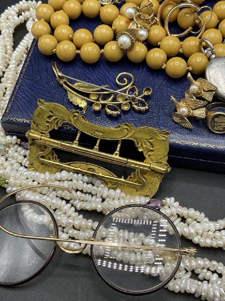 Compiled Vintage Costume Jewelry Group and Eye Glasses.