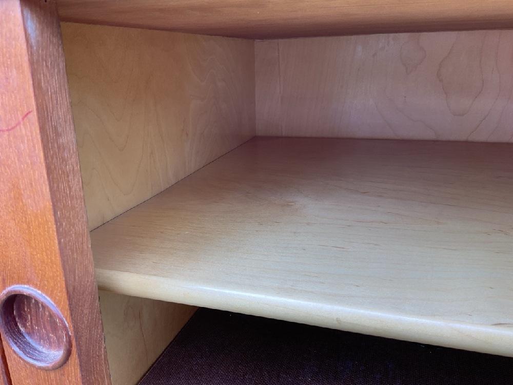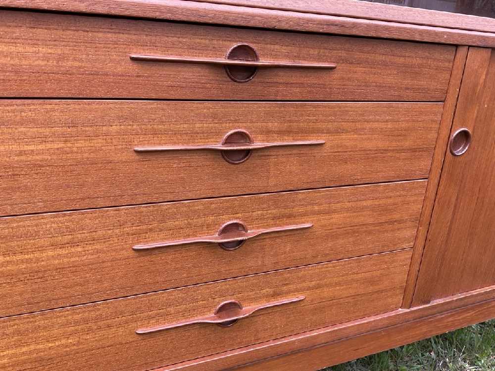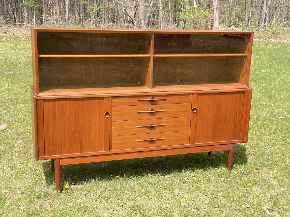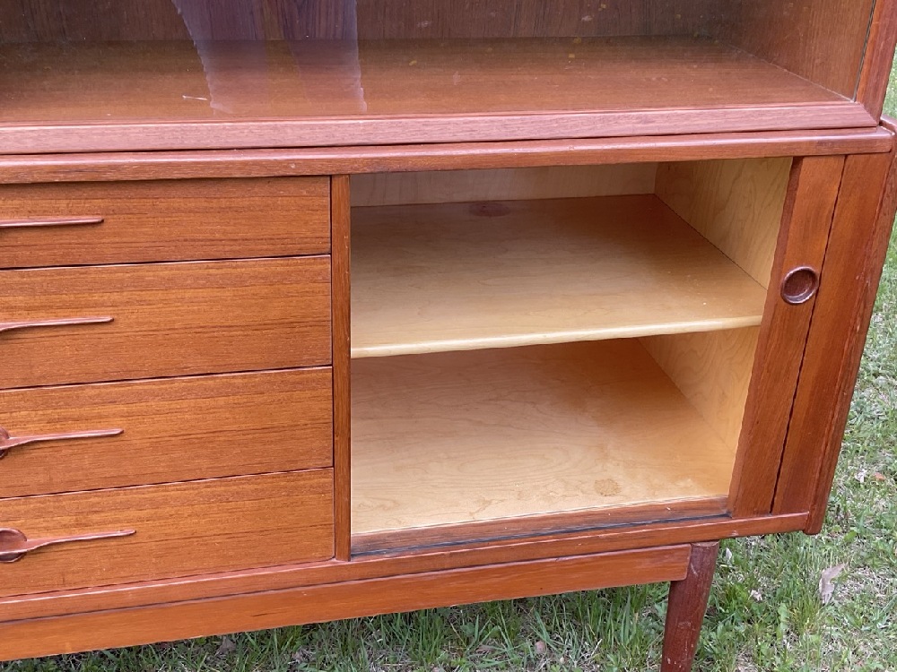 LYBY MOBLER MCM Danish Modern Teakwood Breakfront Cabinet. Maple secondary wood. Comes apart in three pieces. Signed with stamp.