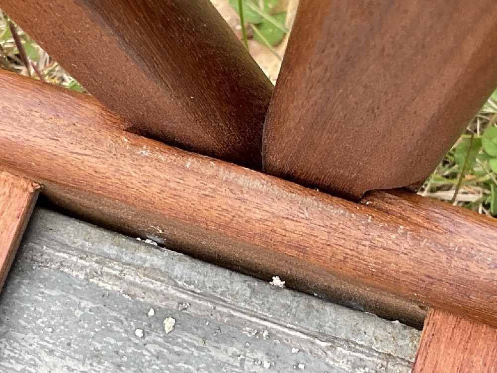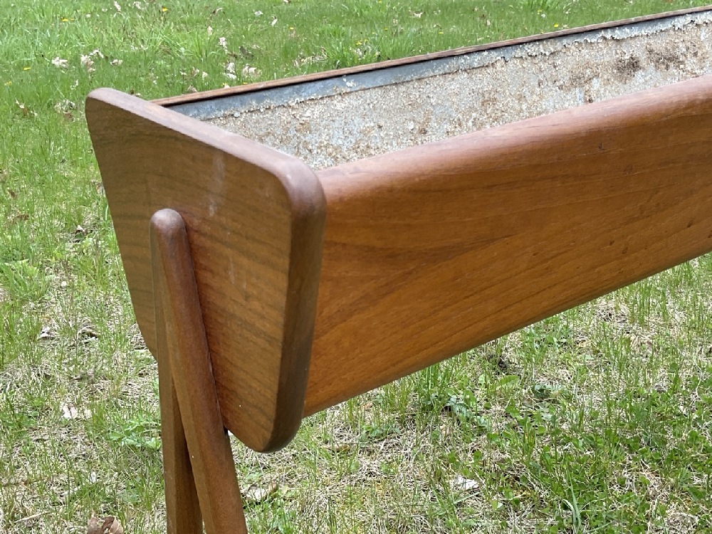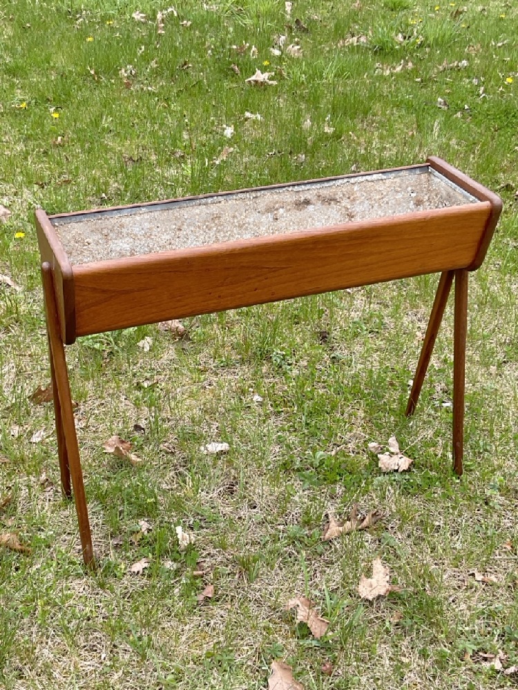 Metal insert shows wear from use. Overall teakwood and legs very good. Legs slide out for working with planter.