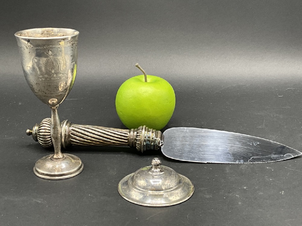 Three (3) Piece Sterling Silver Group. Goblet, Lid and Cake Knife.