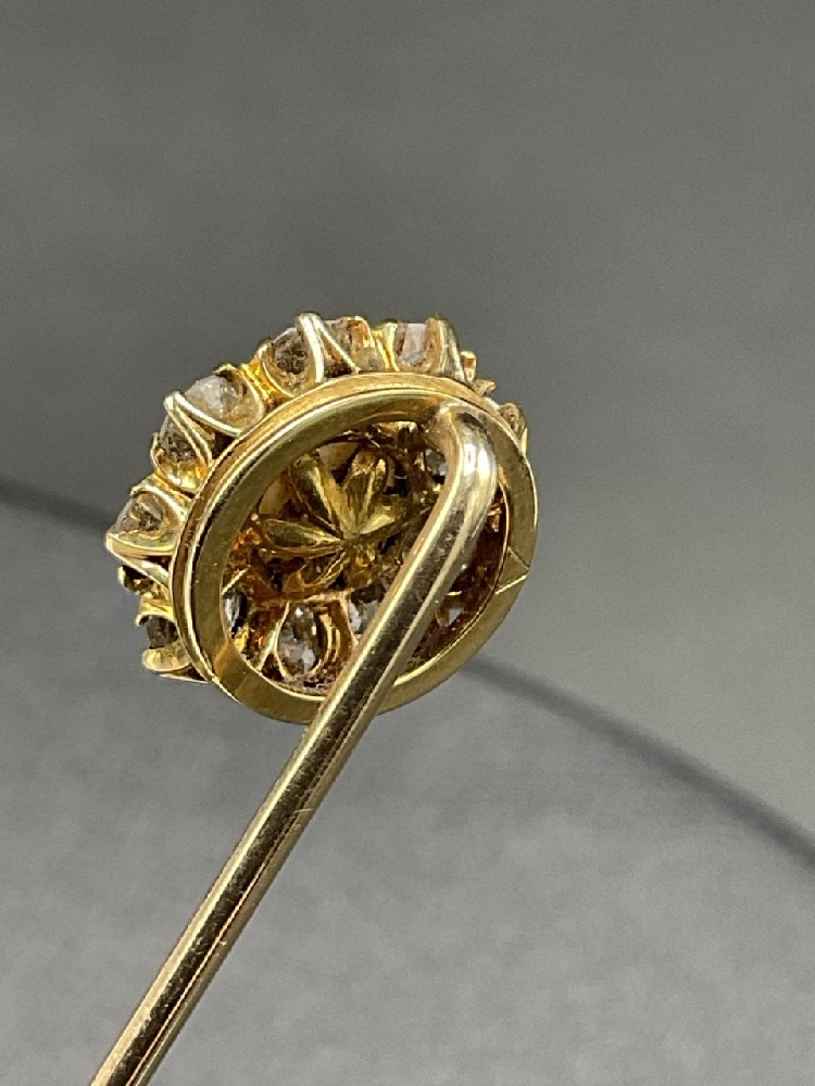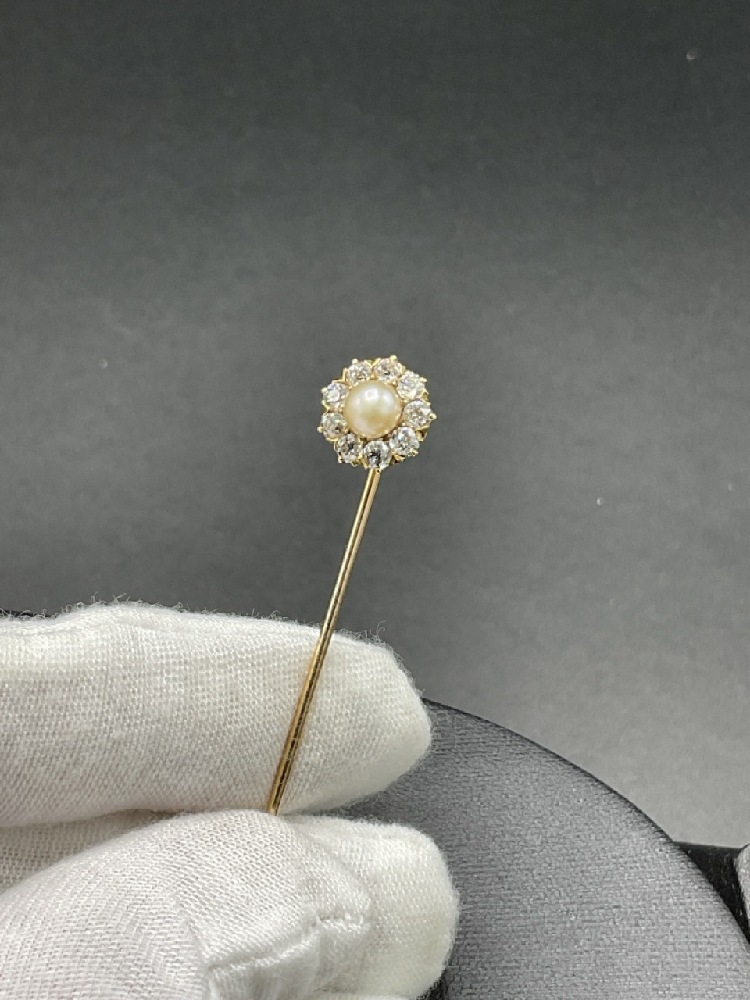 14k Lady's Stick Pin with Freshwater Pearls and Nine (9) Mine Cut Diamonds. Total weight: 4.7 grams.