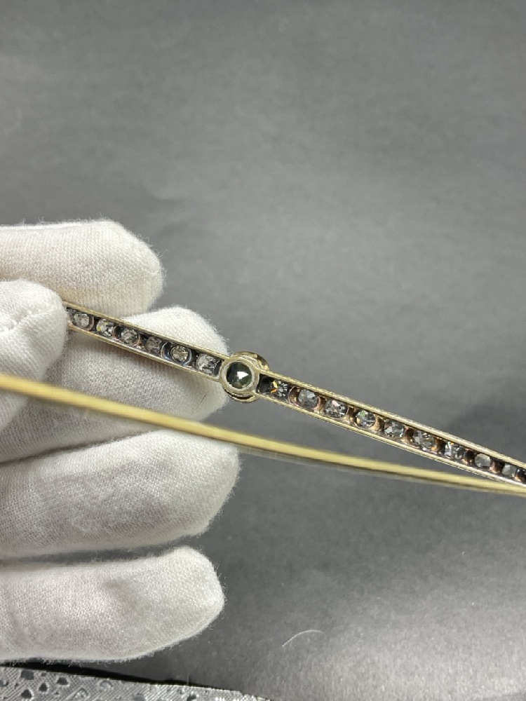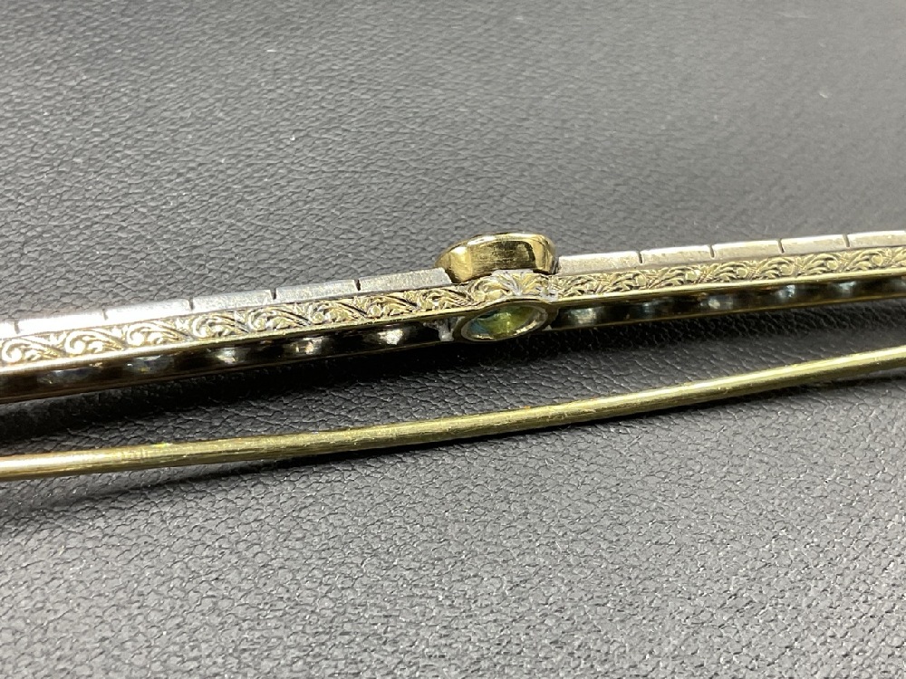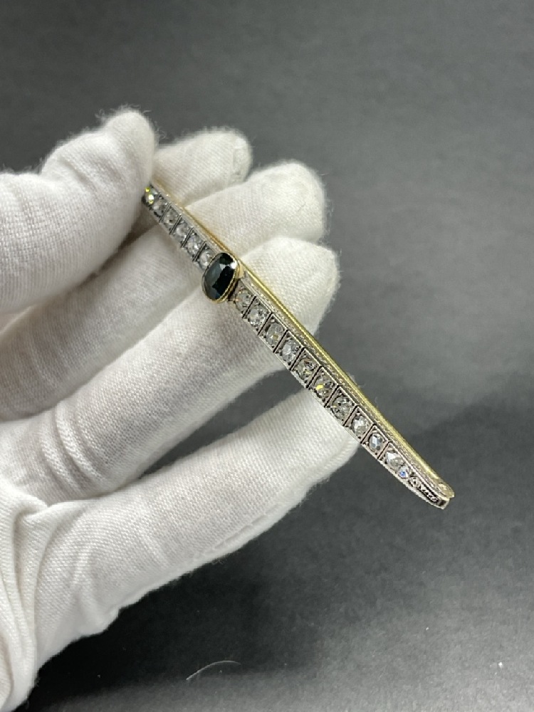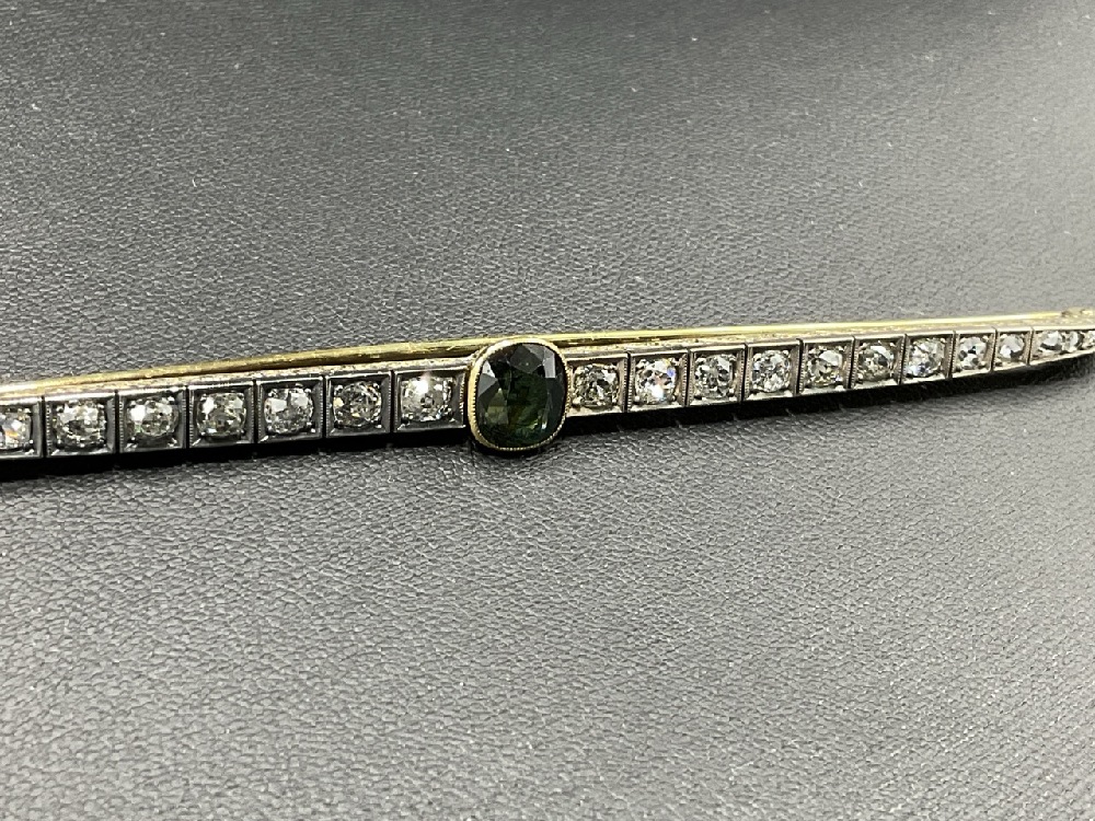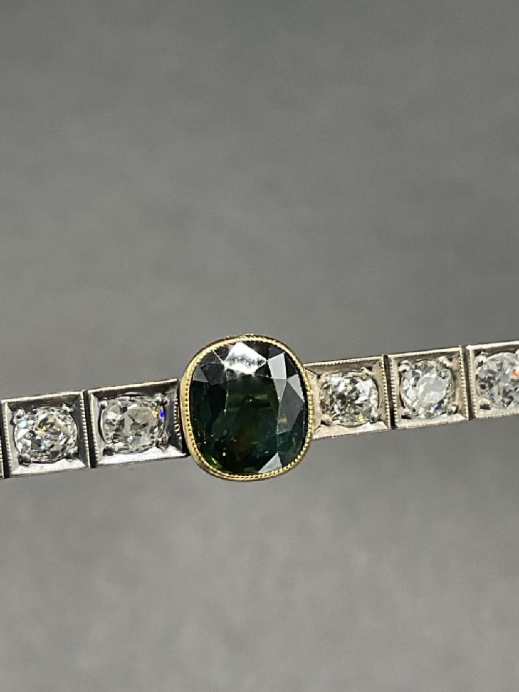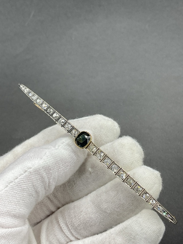 A fine 14K antique bar pin with rare 1.50 ct. Blue-Green Sapphire Stone and 24 Mine cut and single cut diamonds. Total weight of diamonds 2.75 ct. Pin is 14K gold and sterling silver. Total weight: 9.30 grams.