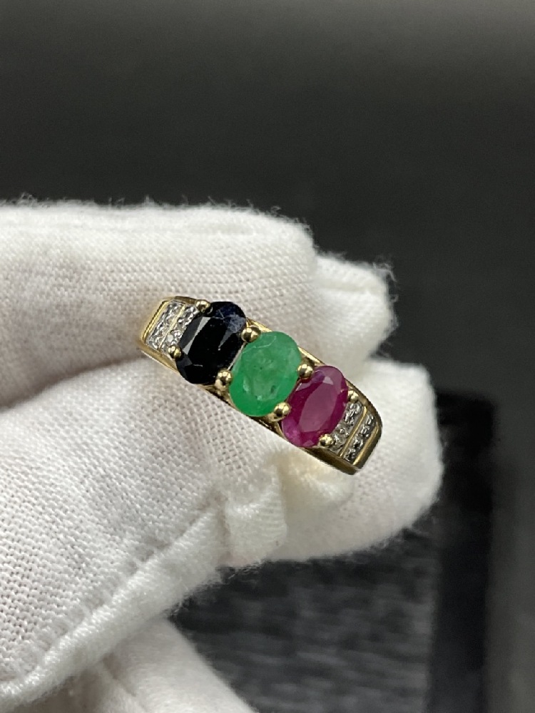 14K Ruby, Emerald and Blue Sapphire Ring with Diamonds.