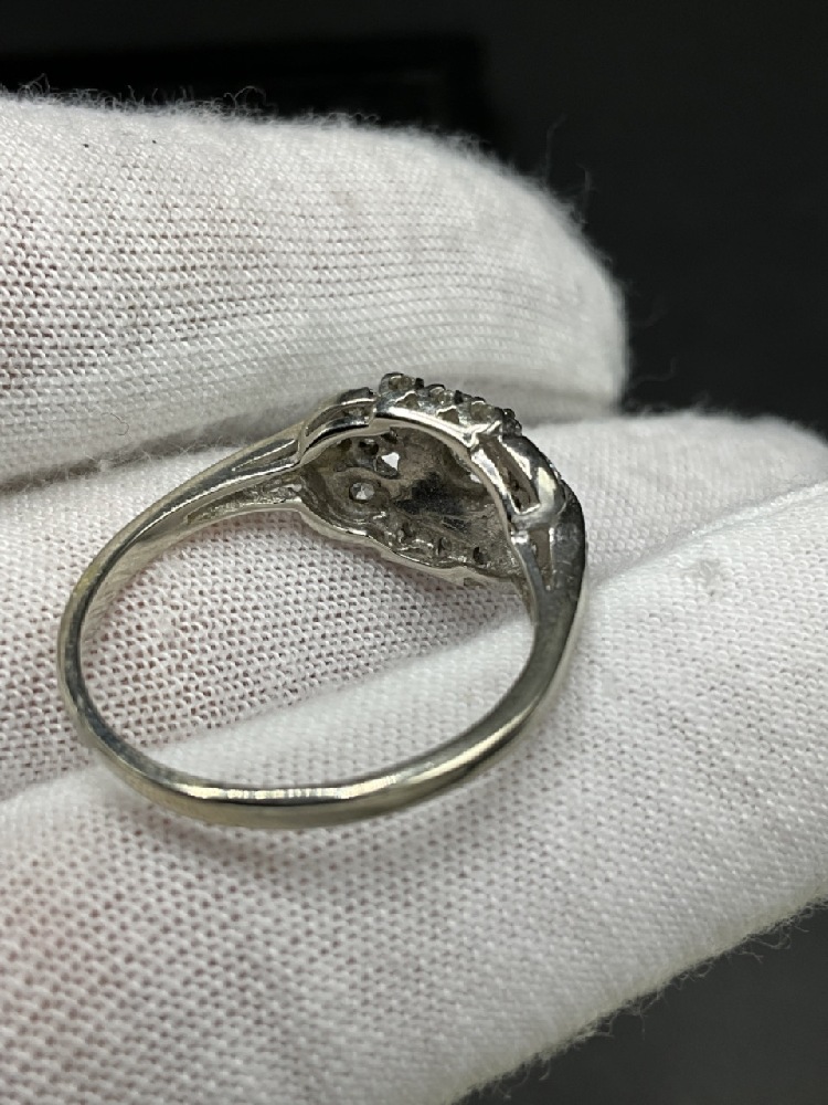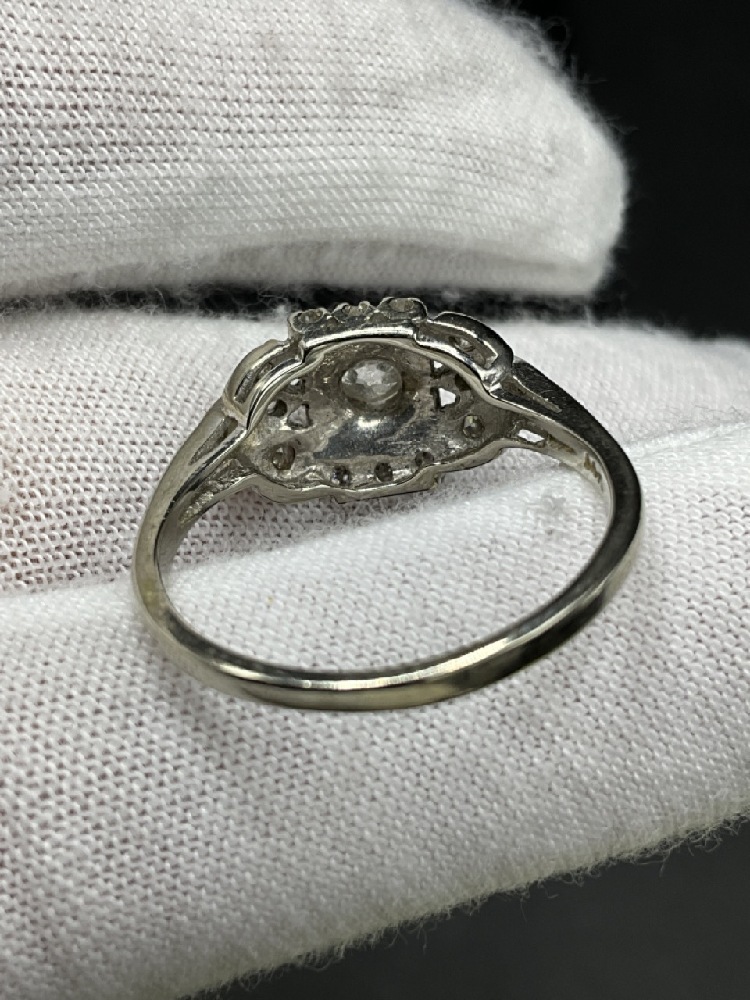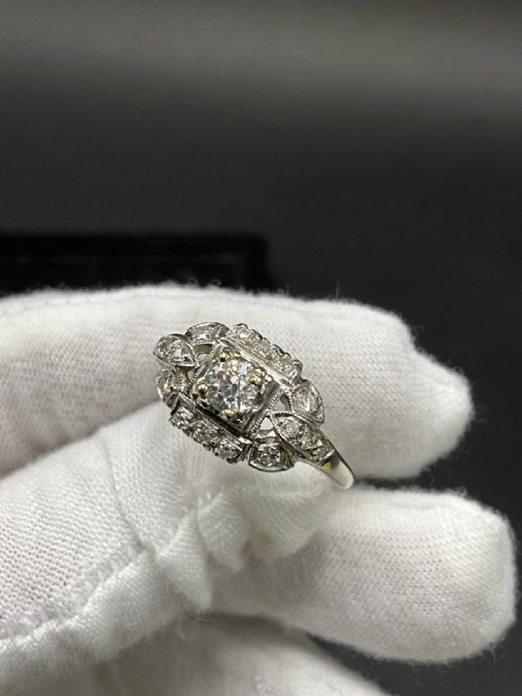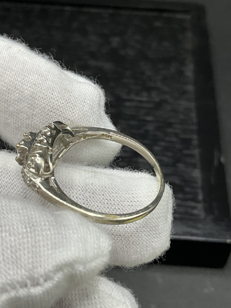 14K White Gold Diamond Ring. Center large stone surrounded by smaller mine cut diamonds.