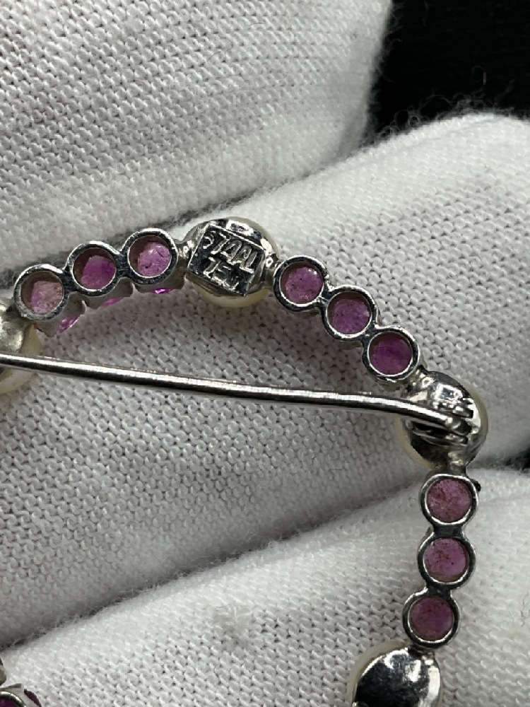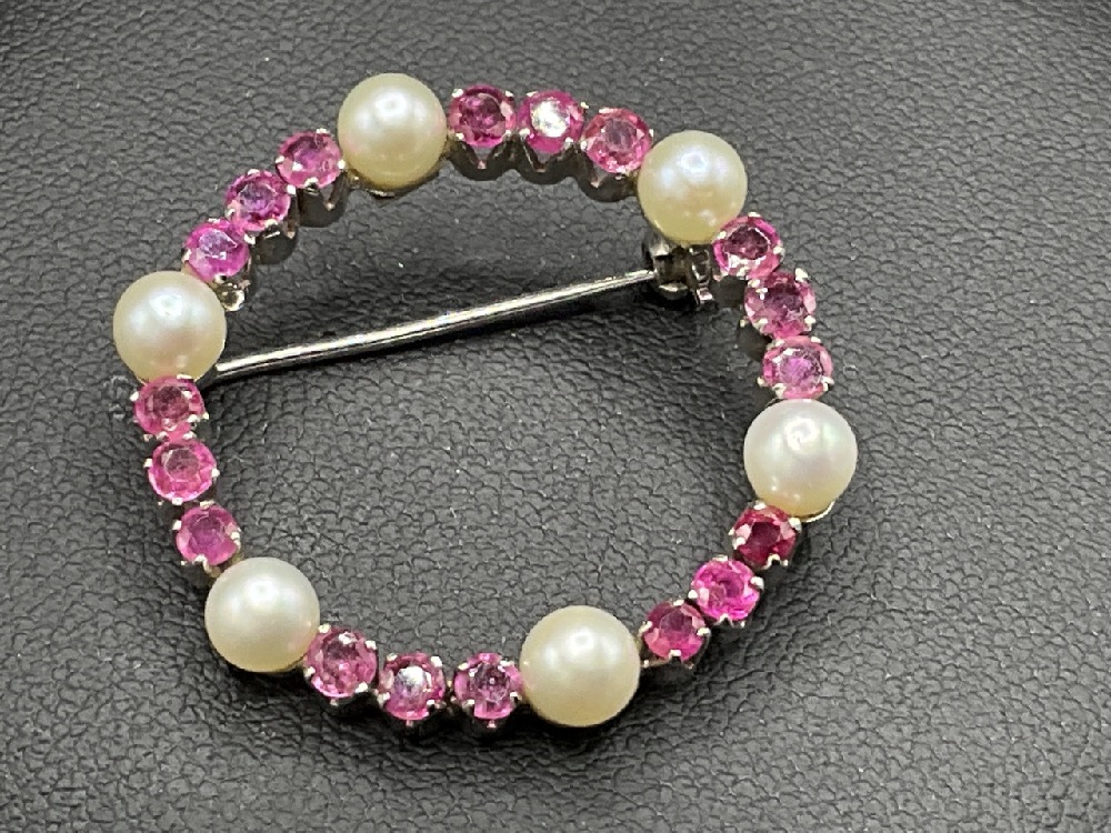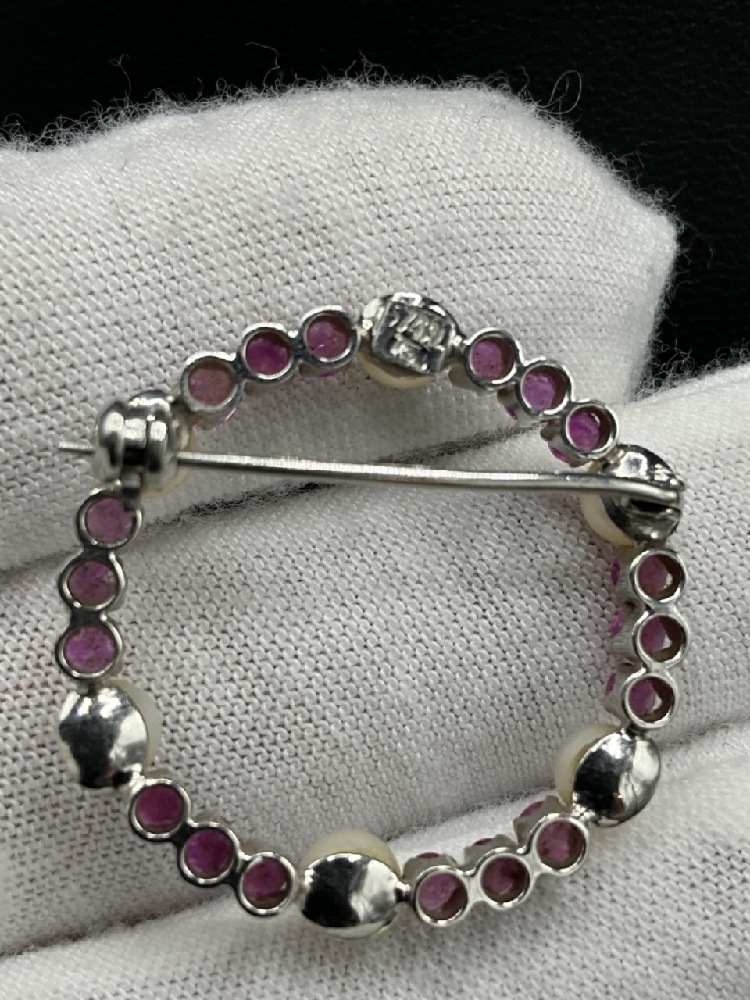 18K Ruby and Pearl Elegant Circular Form Pin.