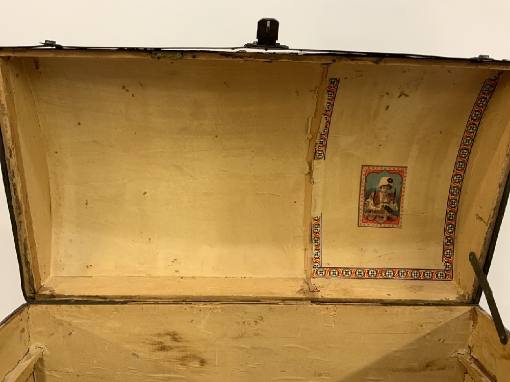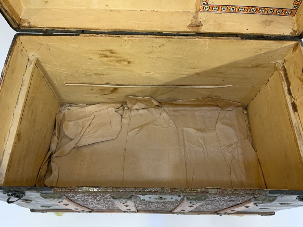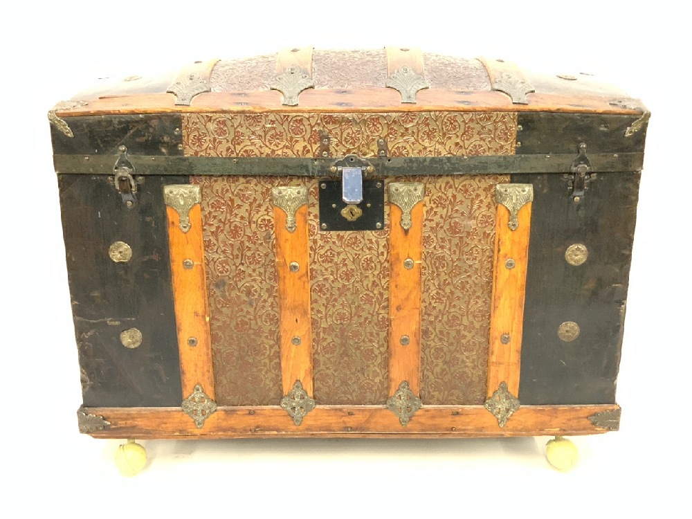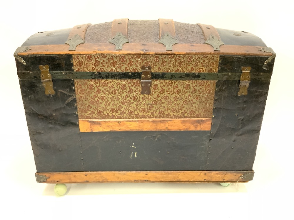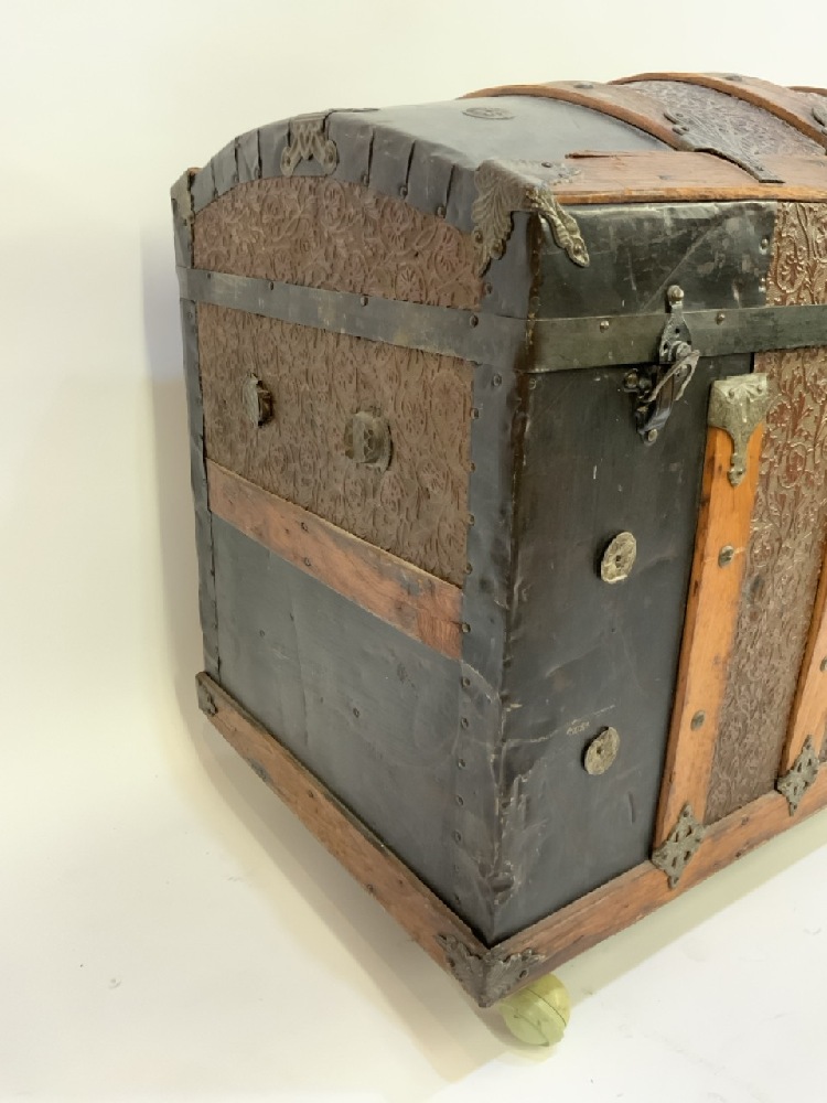 Antique Humpback Trunk With Iron & Brass Fittings on Wheels.
