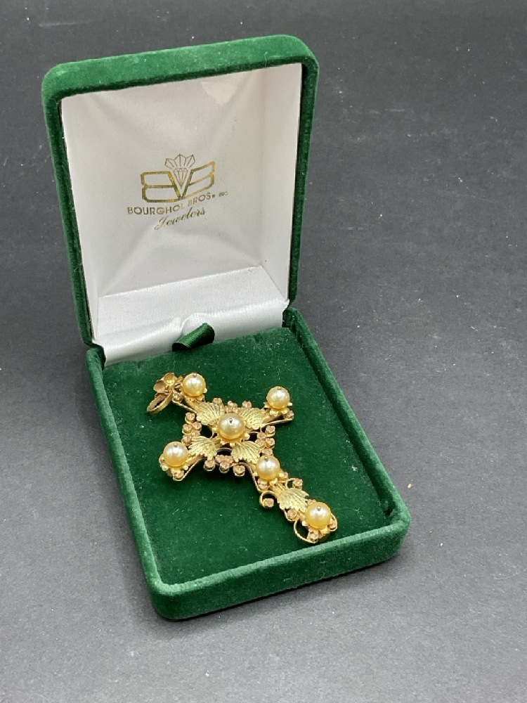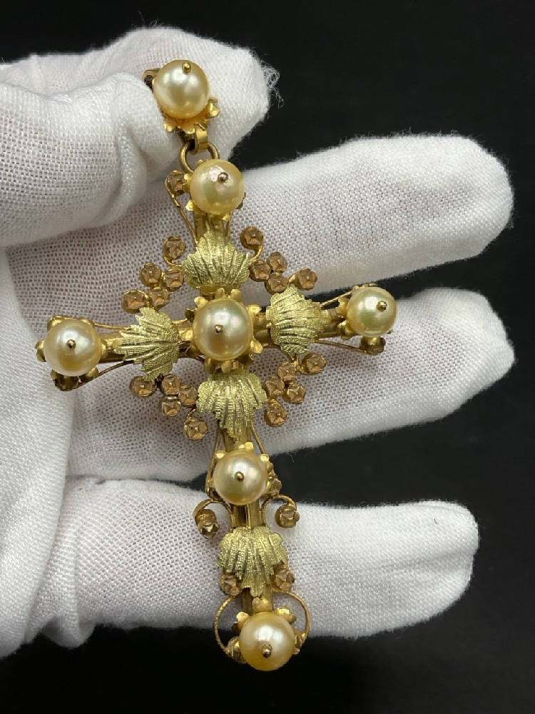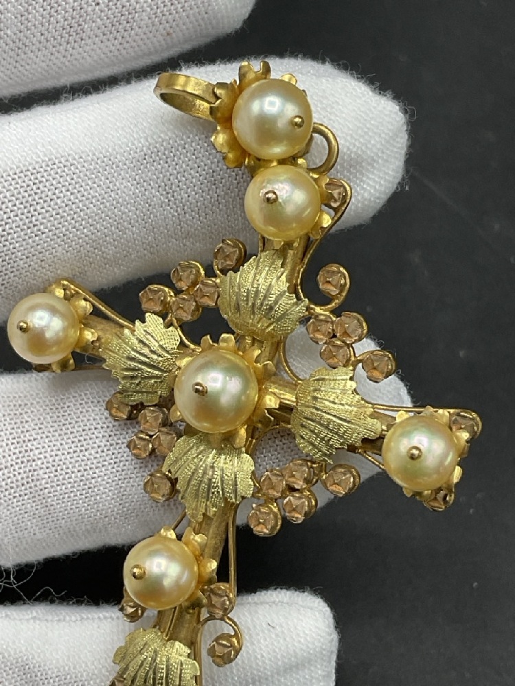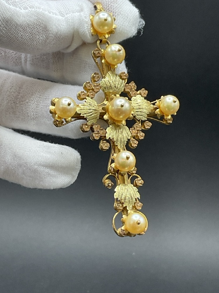 10K European Rose and Yellow Gold Large Cross Pendant with Freshwater Pearls.