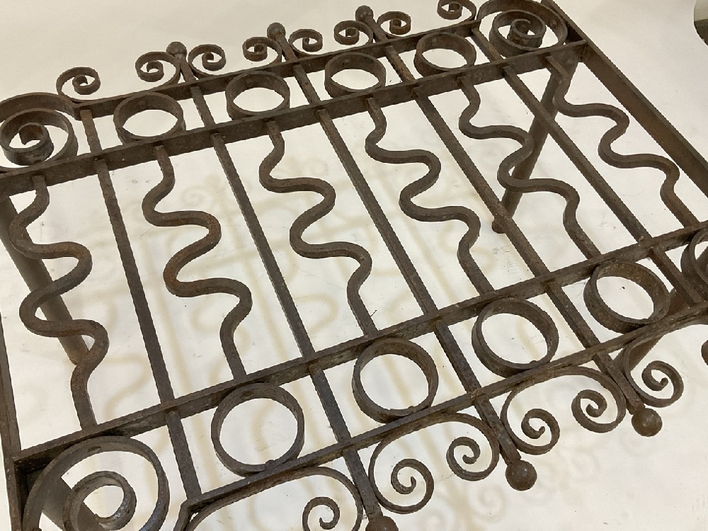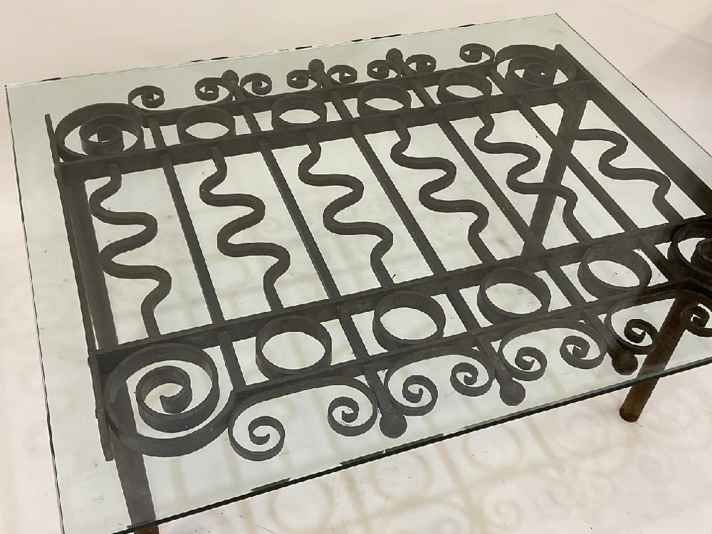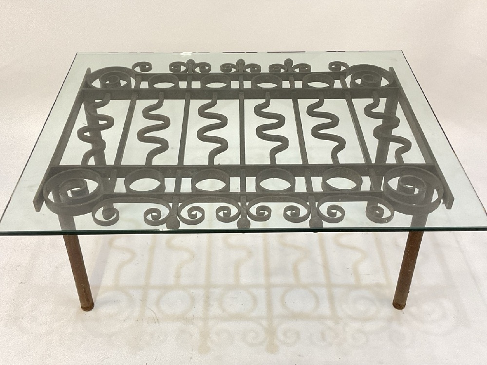 Antique Wrought Iron Square Grate Glass Top Coffee Table.