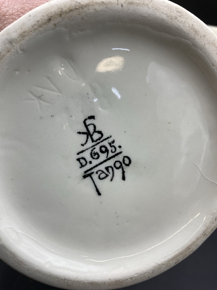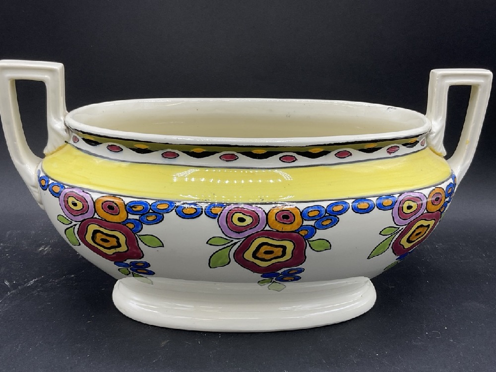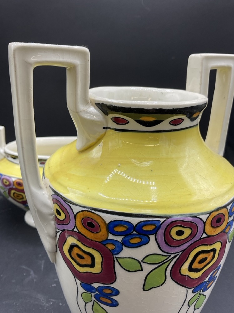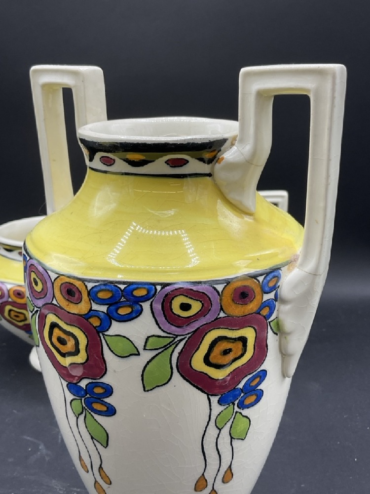 Charles Catteau Boch Freres Pottery Group. A pair of double handled vases and bowl. One vase has stress cracks noted in handle. Please see photograph preview.