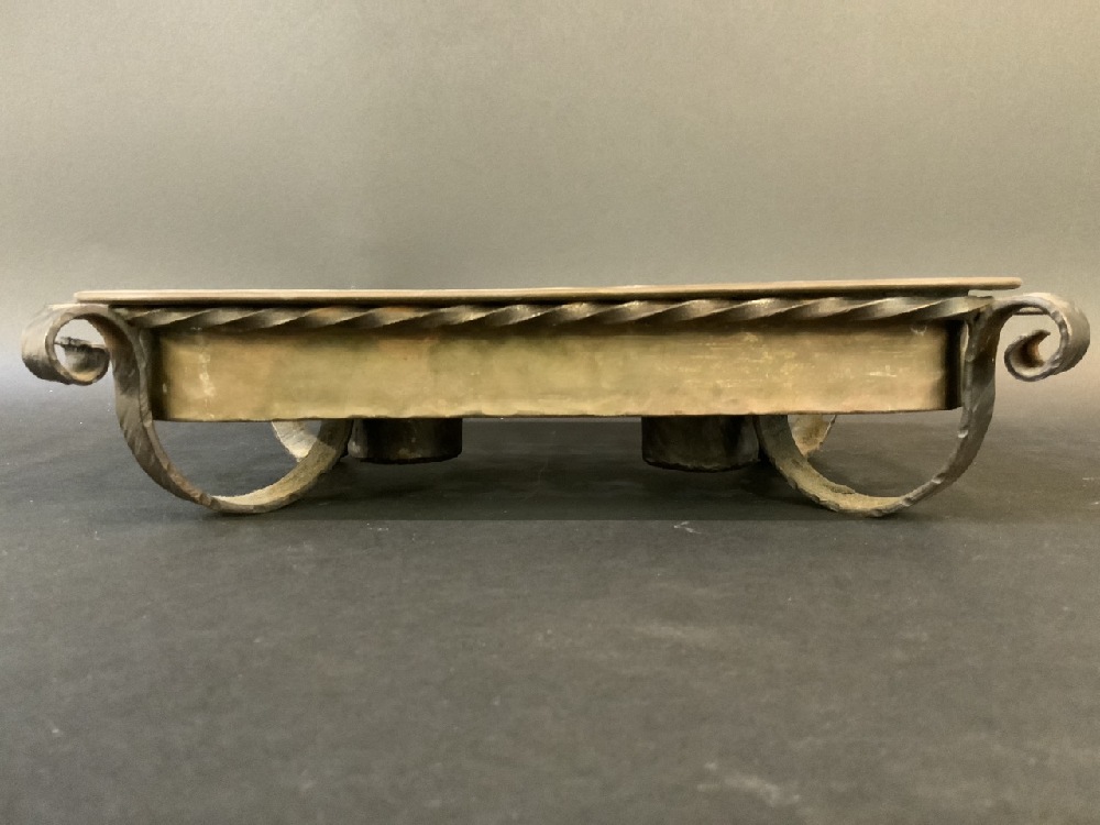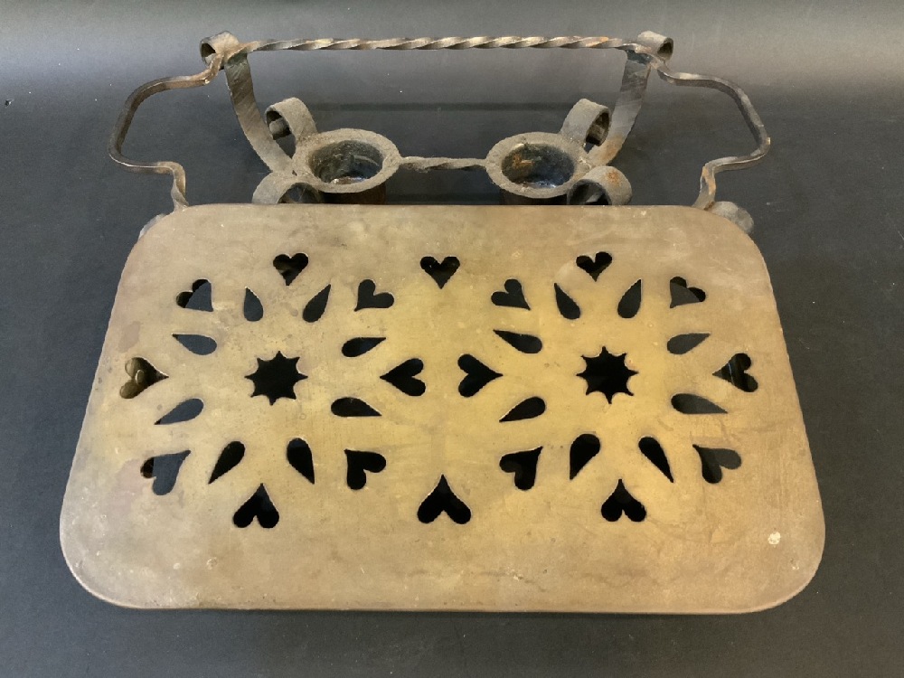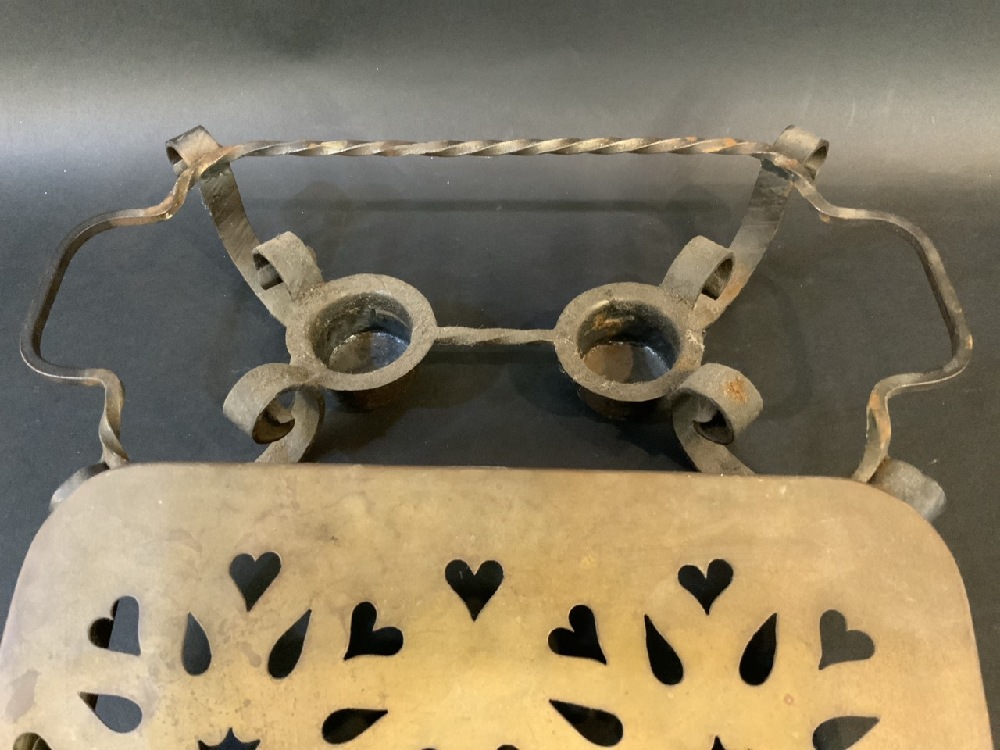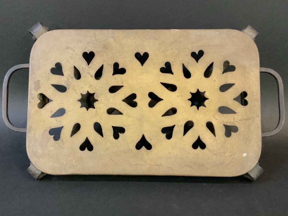 Primitive Folk Art Brass Warming Trivet - Wrought Iron Base. Cut out hearts and spade design.