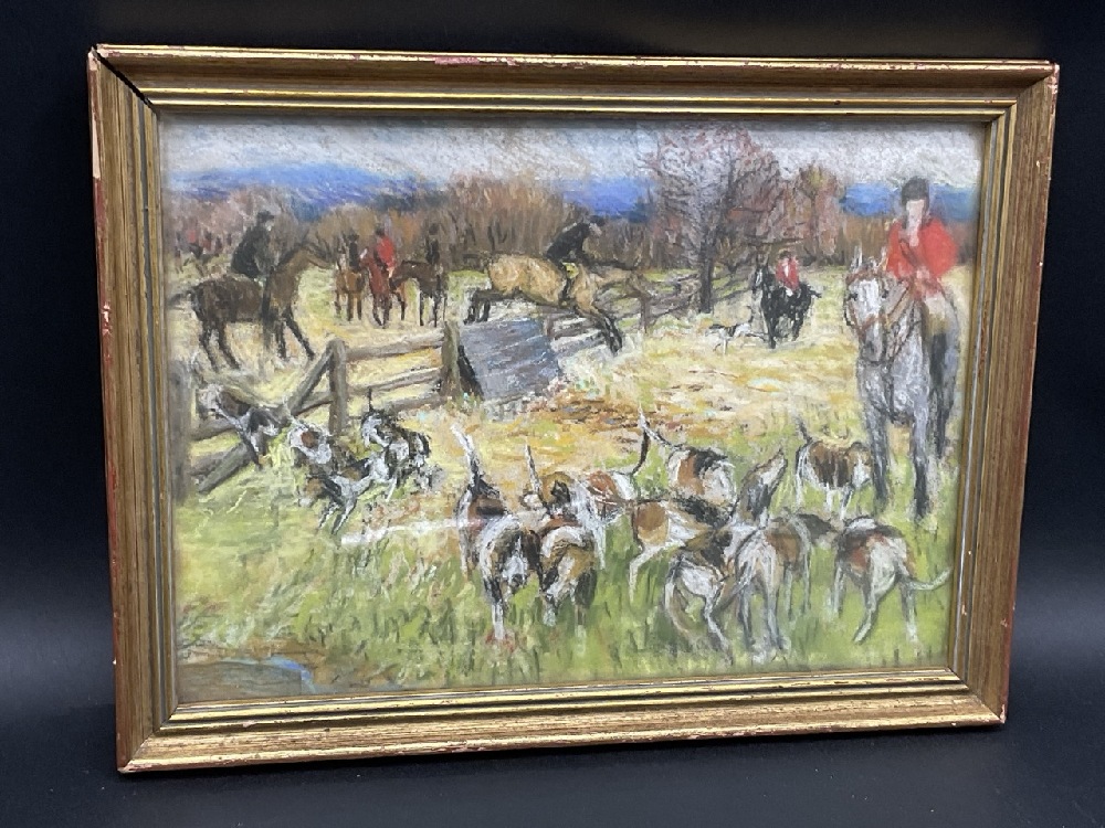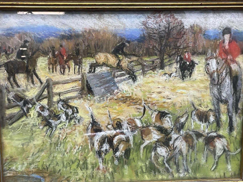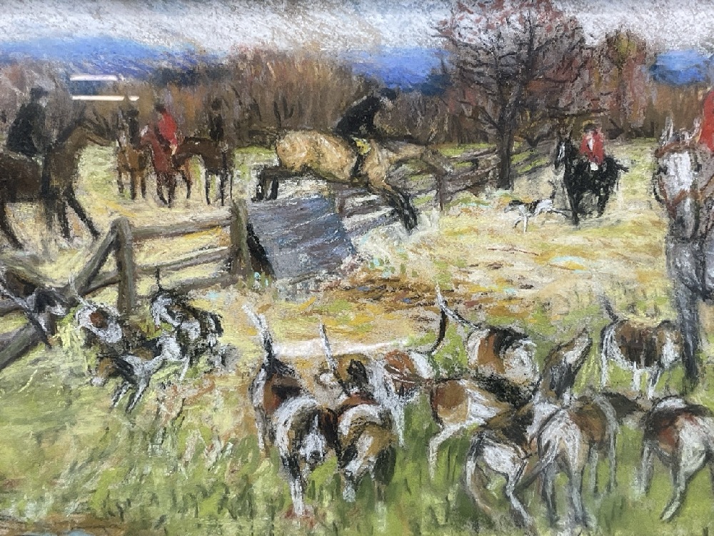 Fox hunt landscape painting wiith hunting dogs and horses.