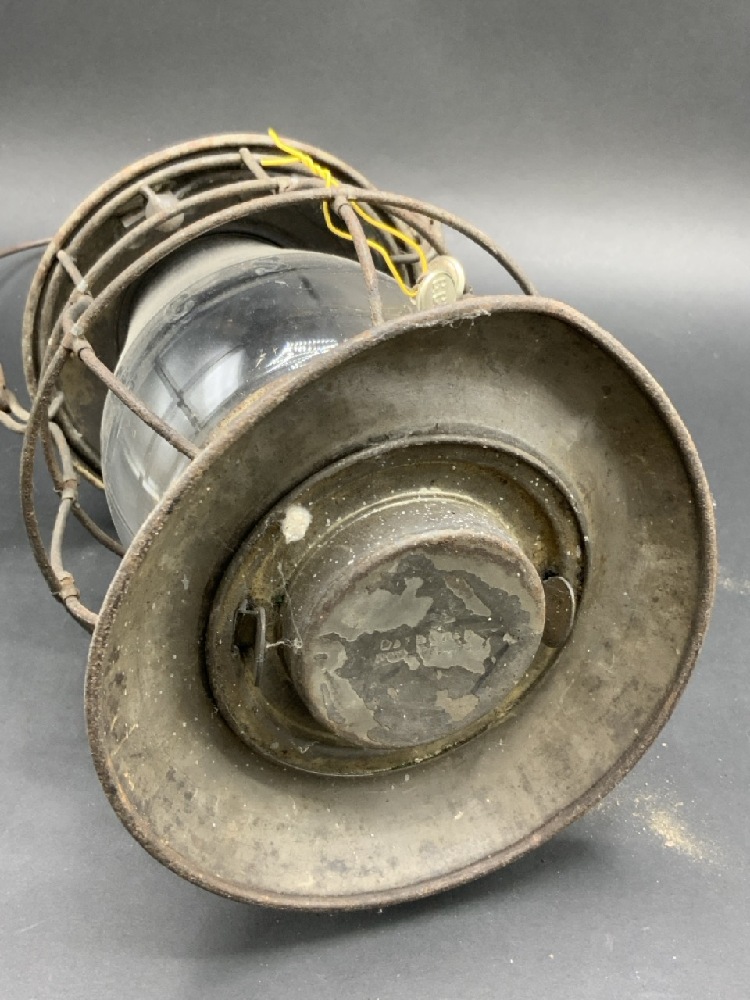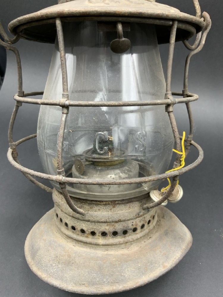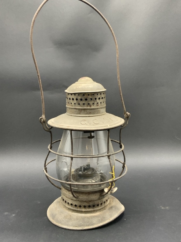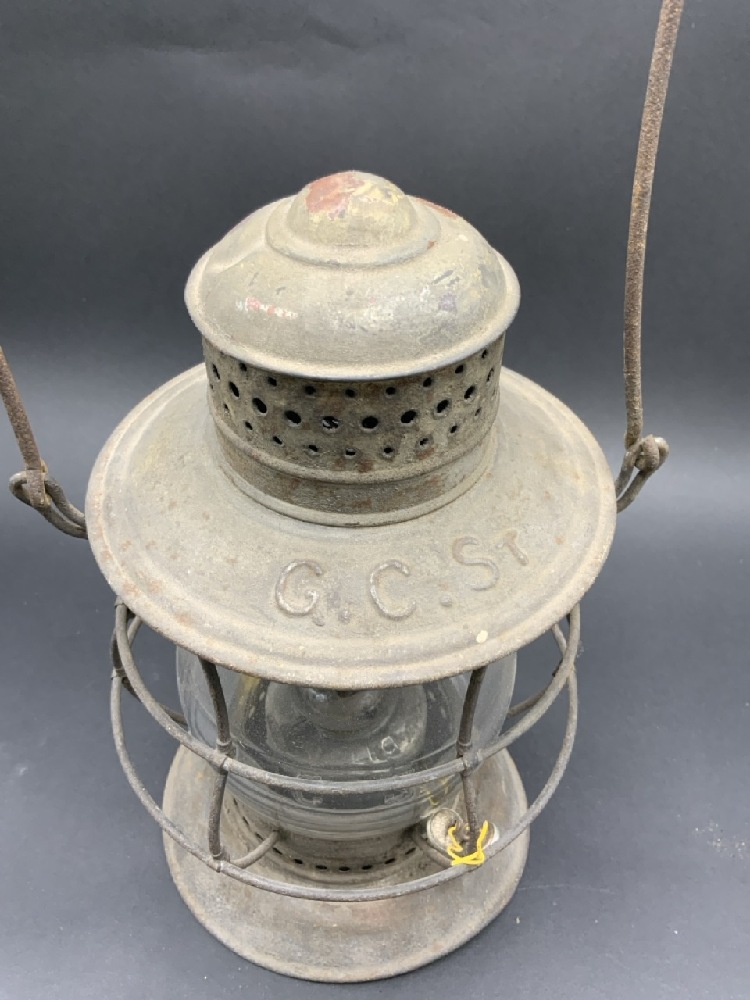 G C ST RAILROAD LANTERN. Grand Central. Matching clear glass globe present. Base is dented.