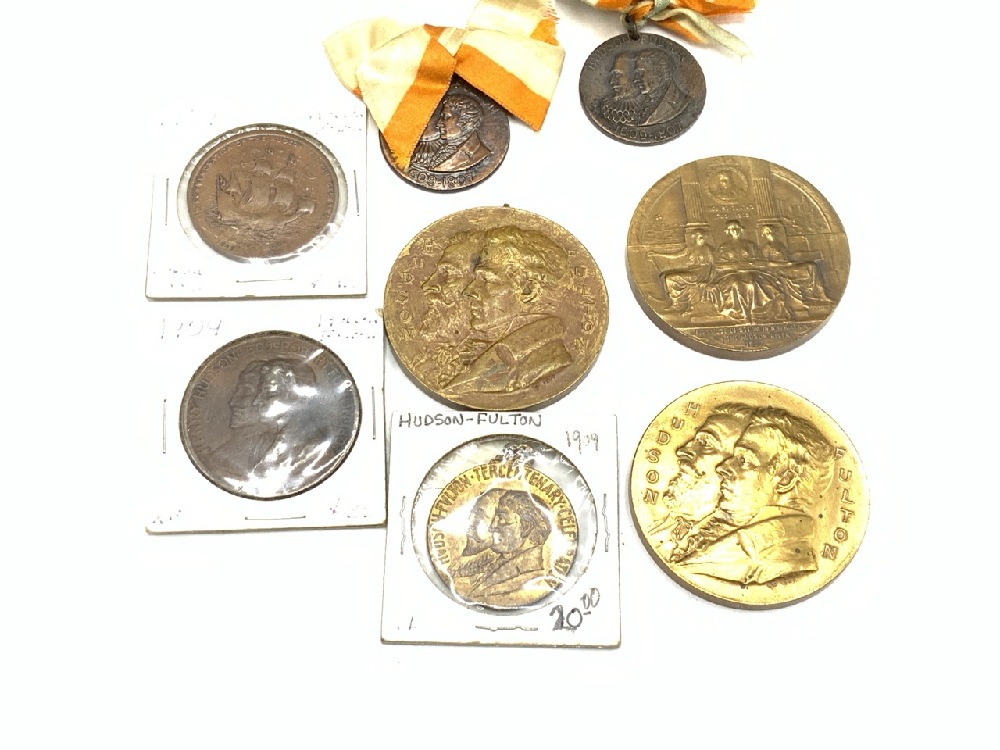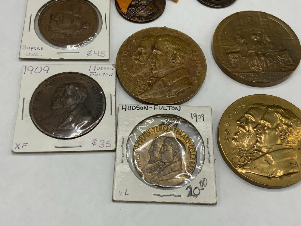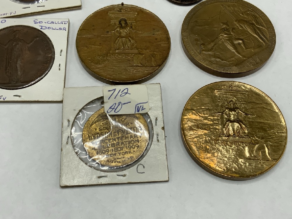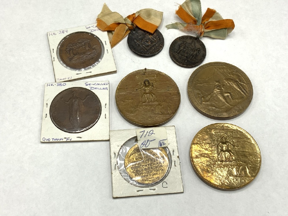Eight (8) Bronze Hudson Fulton Medallions and "So Called Dollars" . c. 1909 Hudson Fulton Celebration.