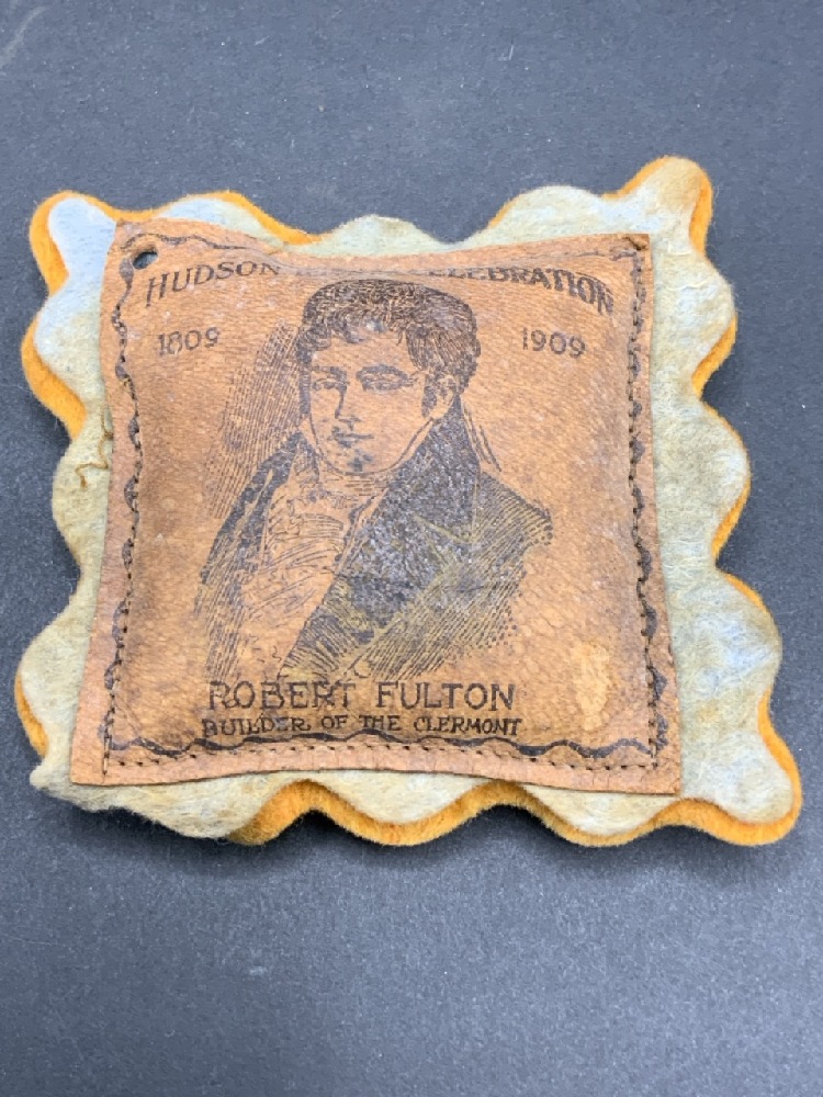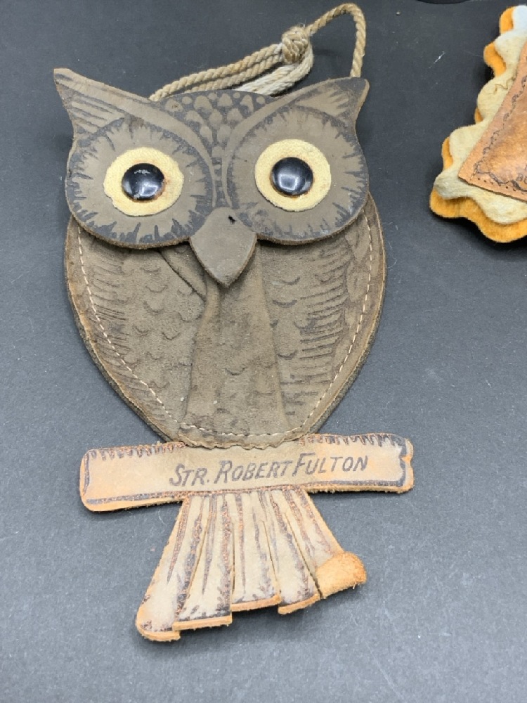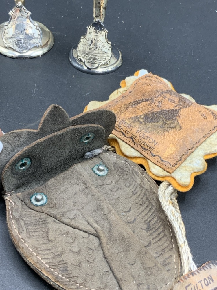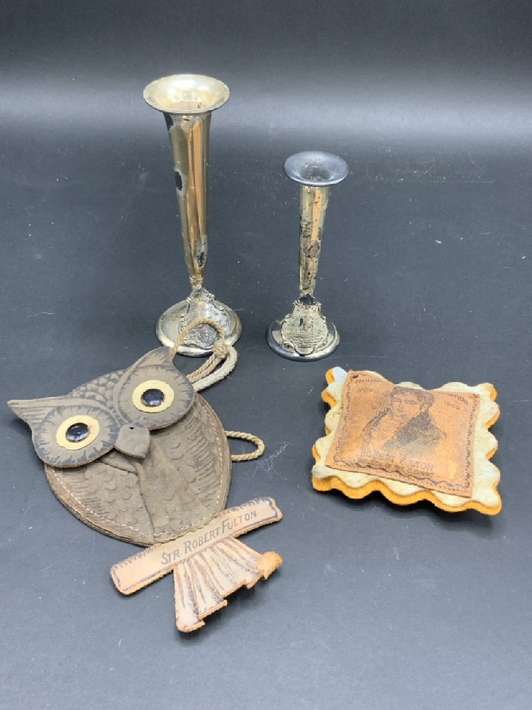 Hudson Fulton Celebration Bud Vases, Souvenir Pillow and Owl leather change purse.