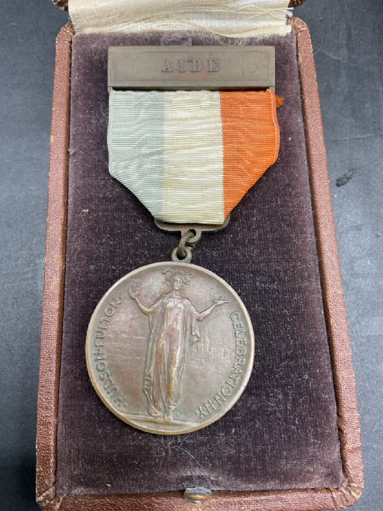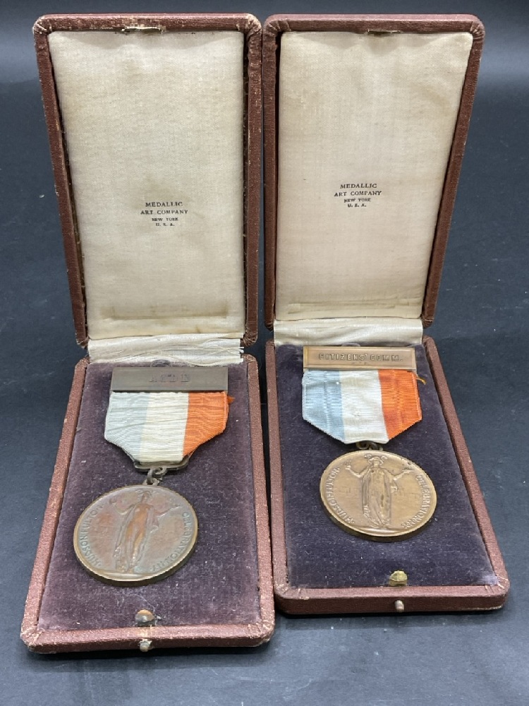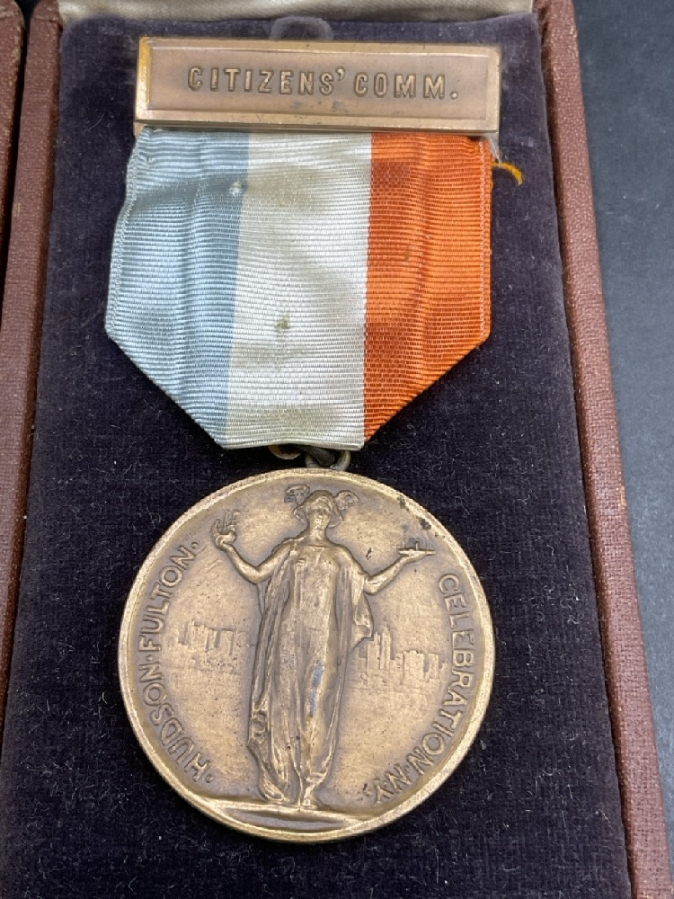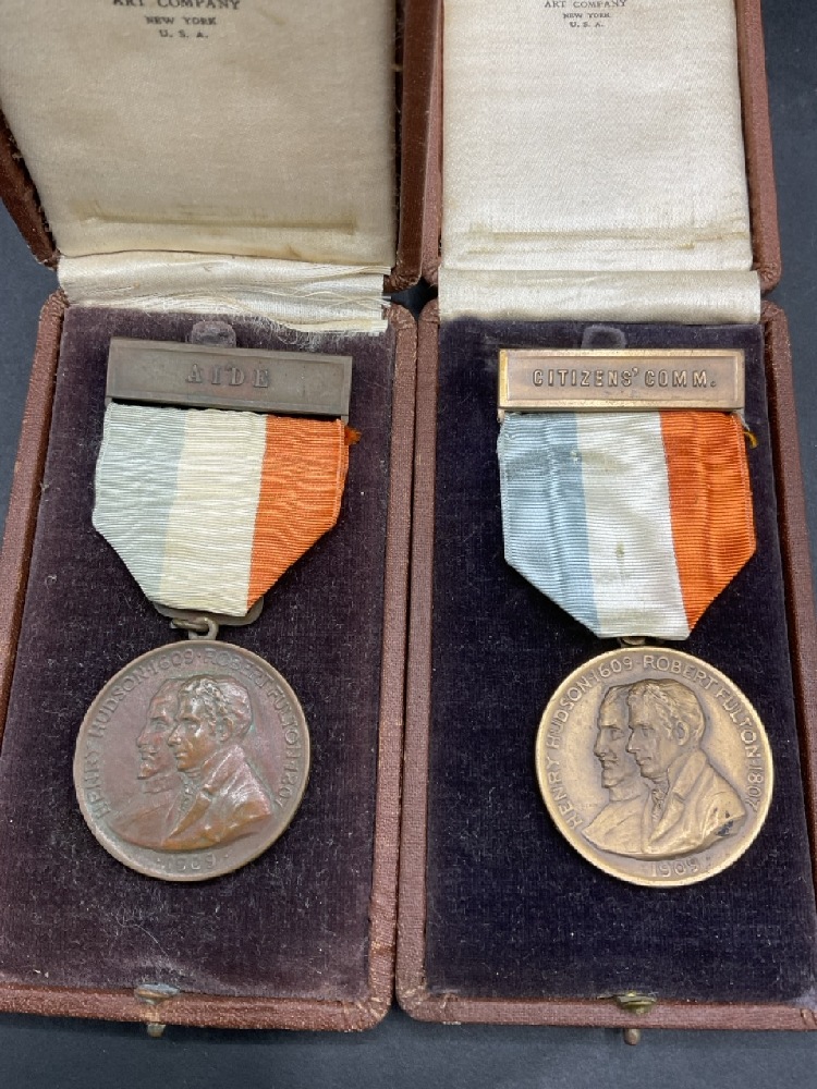 Two (2) Bronze 1909 Hudson Fulton Celebration Citizen and Aide Medals housed in original presentation boxes.