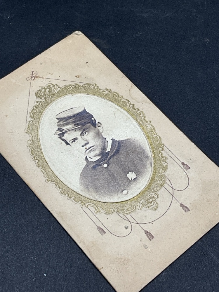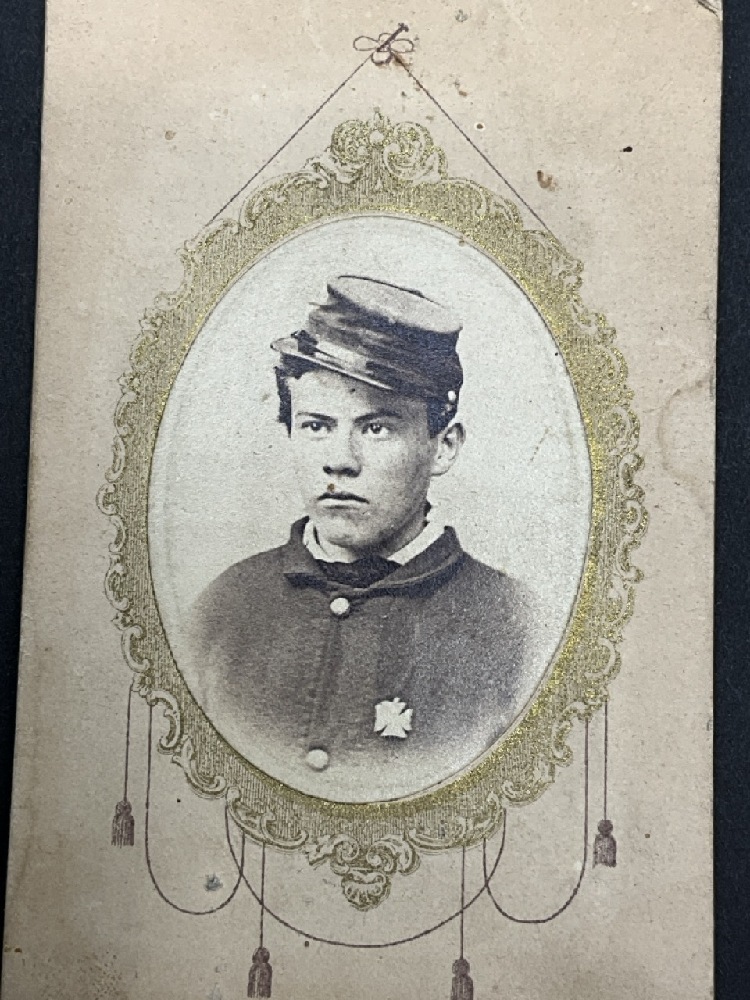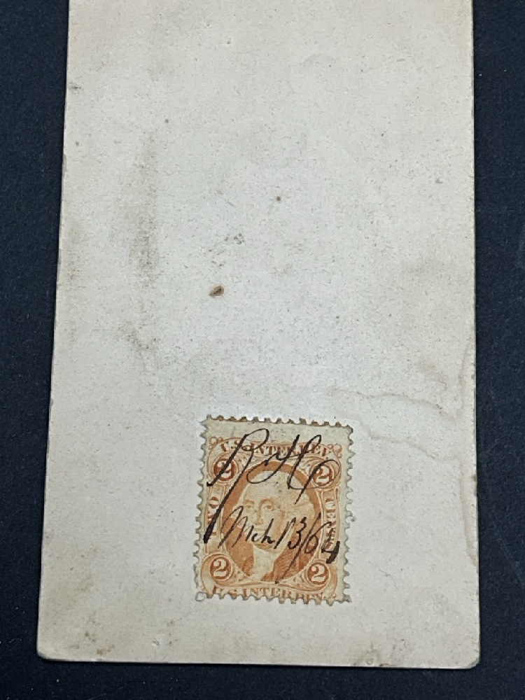 Civil War Soldier Cabinet Card with Cancelled 2c Washington Stamp Dated March 13th, 1864 on reverse.
