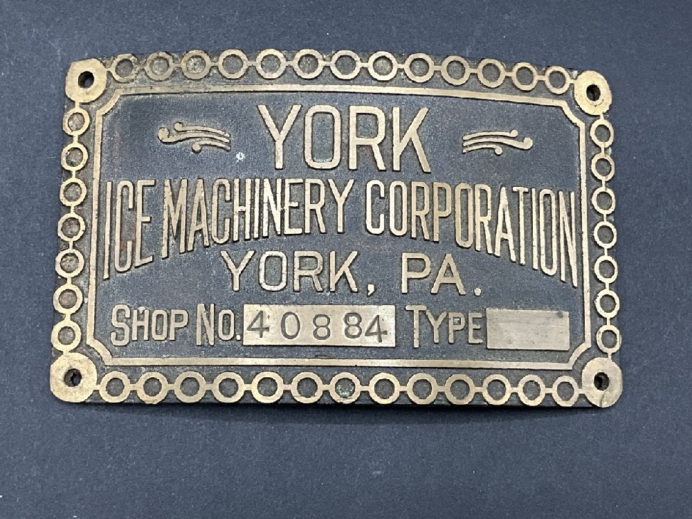 York Ice Machinery Corp. York Pennsylvania Shop Number 40884. Bronze Plaque.