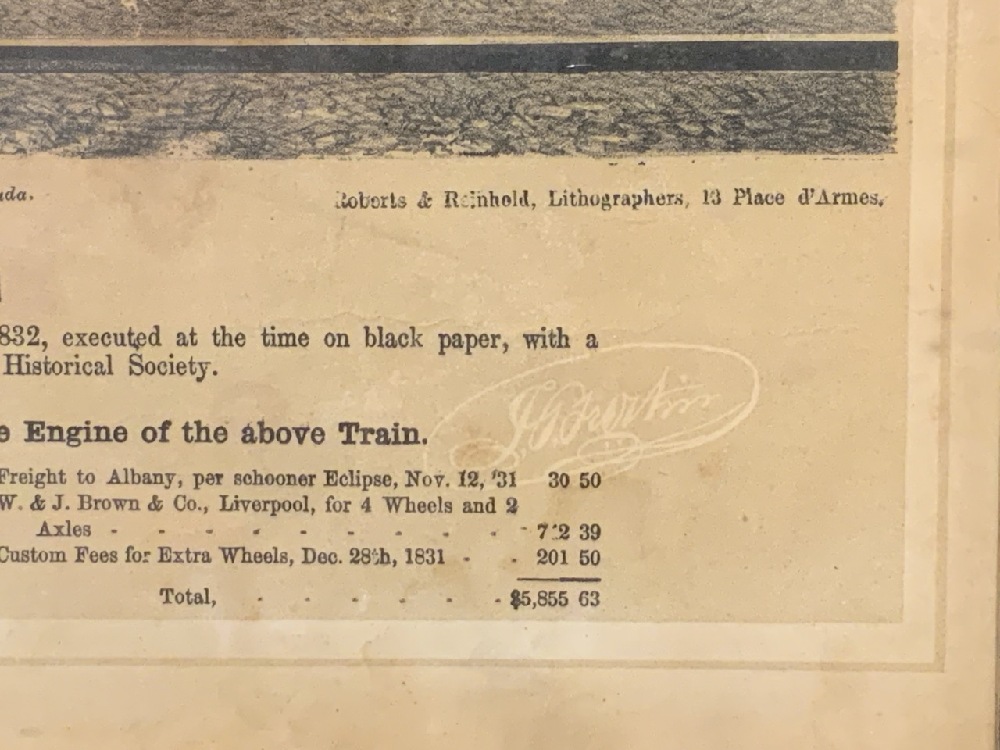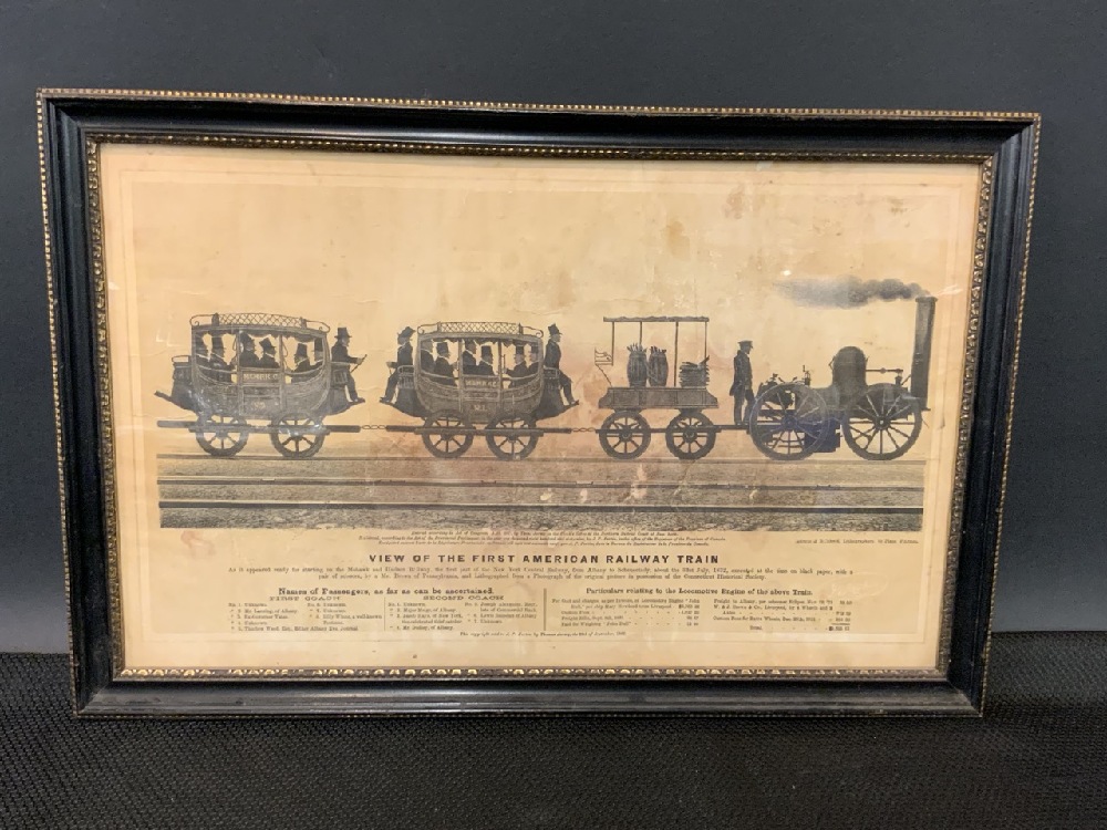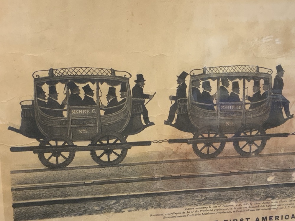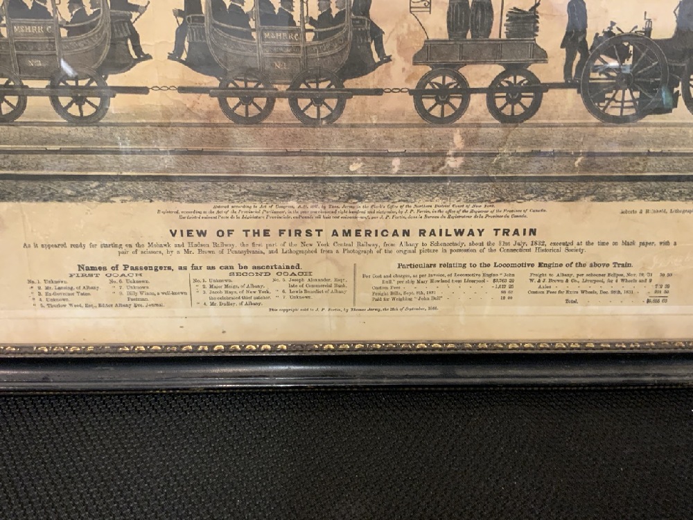 Image of an elevation view of the side of a railroad train of the Mohawk and Hudson Railway depicted in 1832 as a silhouette, with a steam locomotive, with a 2-2-0 wheel arrangement, tender with two barrels of wood and a pile of wood, and two attached carriages holding passengers, with doors labeled "M&H RPG No. 1" and "No. 2"; information of the "Names of Passengers, as far as can be ascertained" and "Particulars relating to the Locomotive Engine of the above Train" are printed in the bottom margin.
