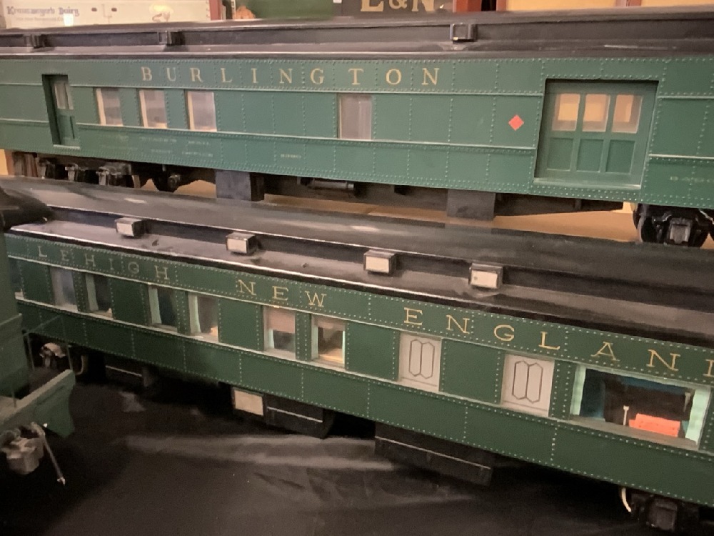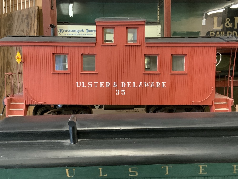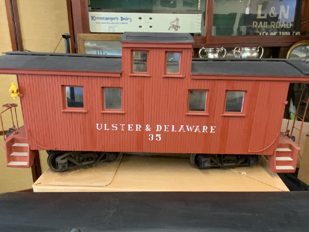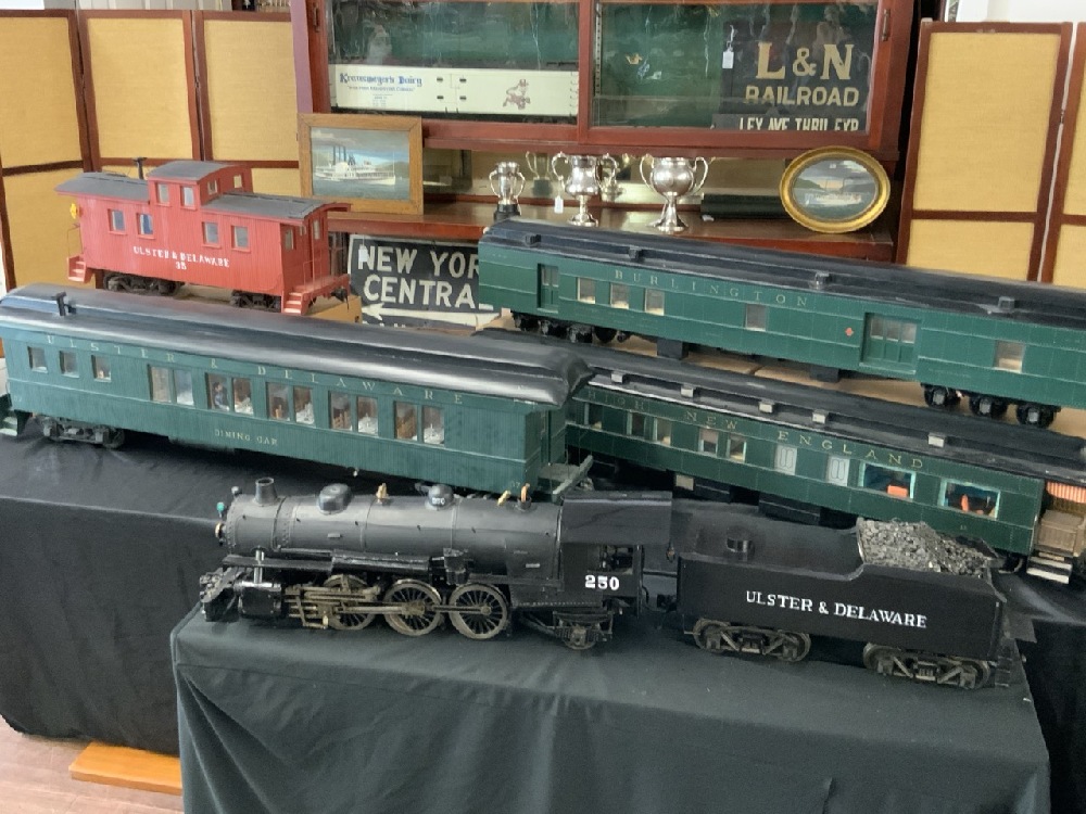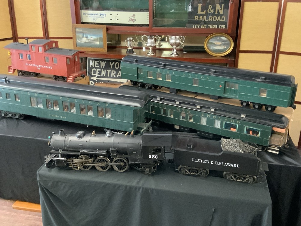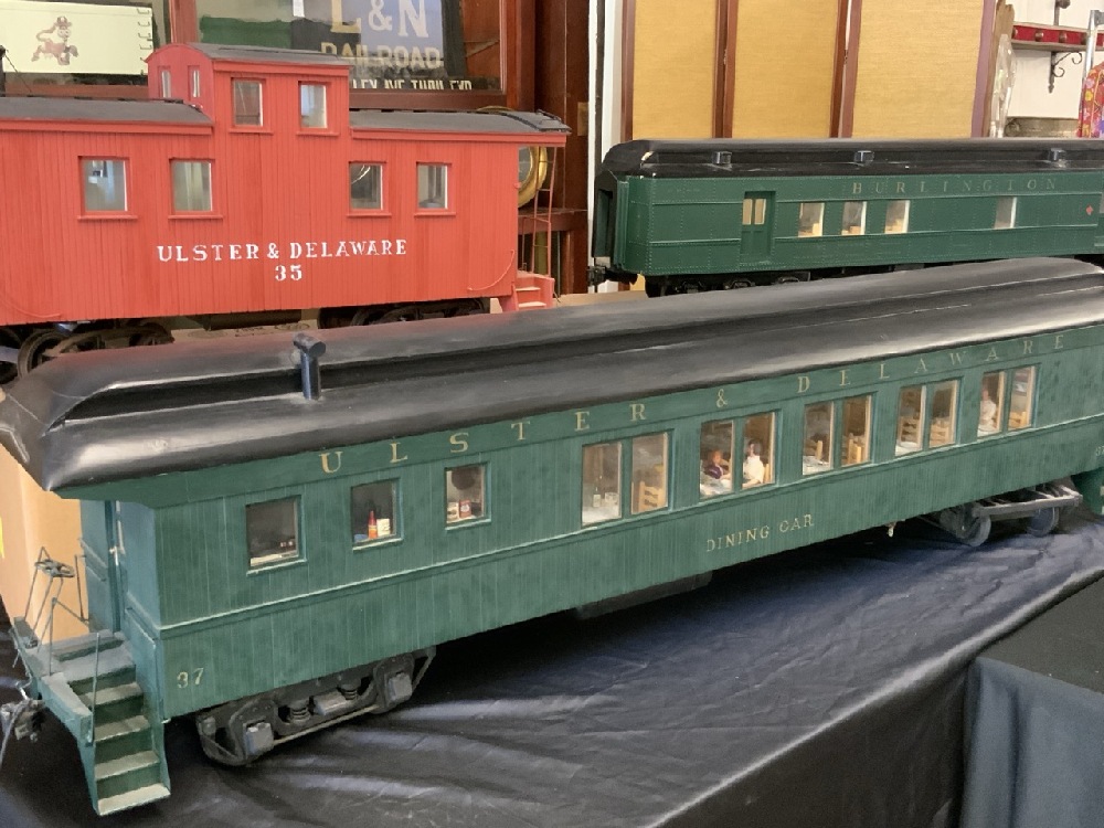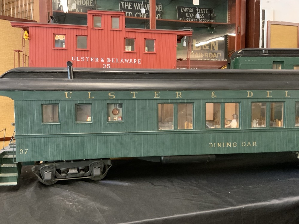 Ulster & Delaware Railroad Six Piece Large Scale Train Model Set. Hand Crafted by Joe Krajicek. Lighted cars with intricate detail and mahogany paneling.