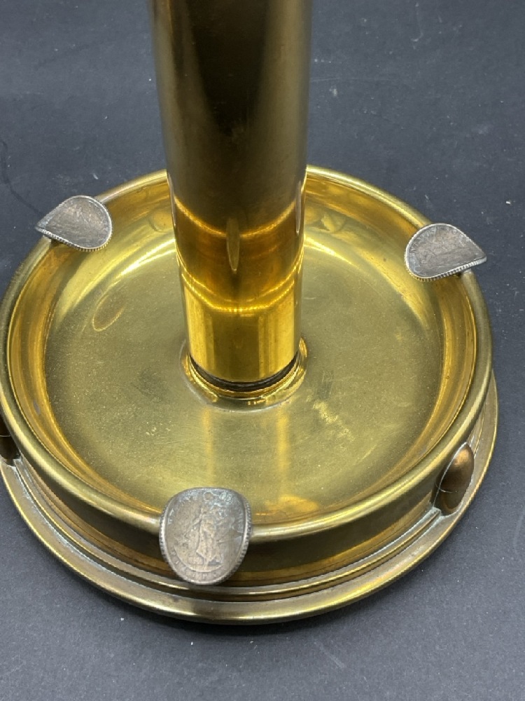 Trench Art Bullet Ashtray. Very high quality craftsmanship with 90mm M19 shell base, bullet accents and centavo silver coins.