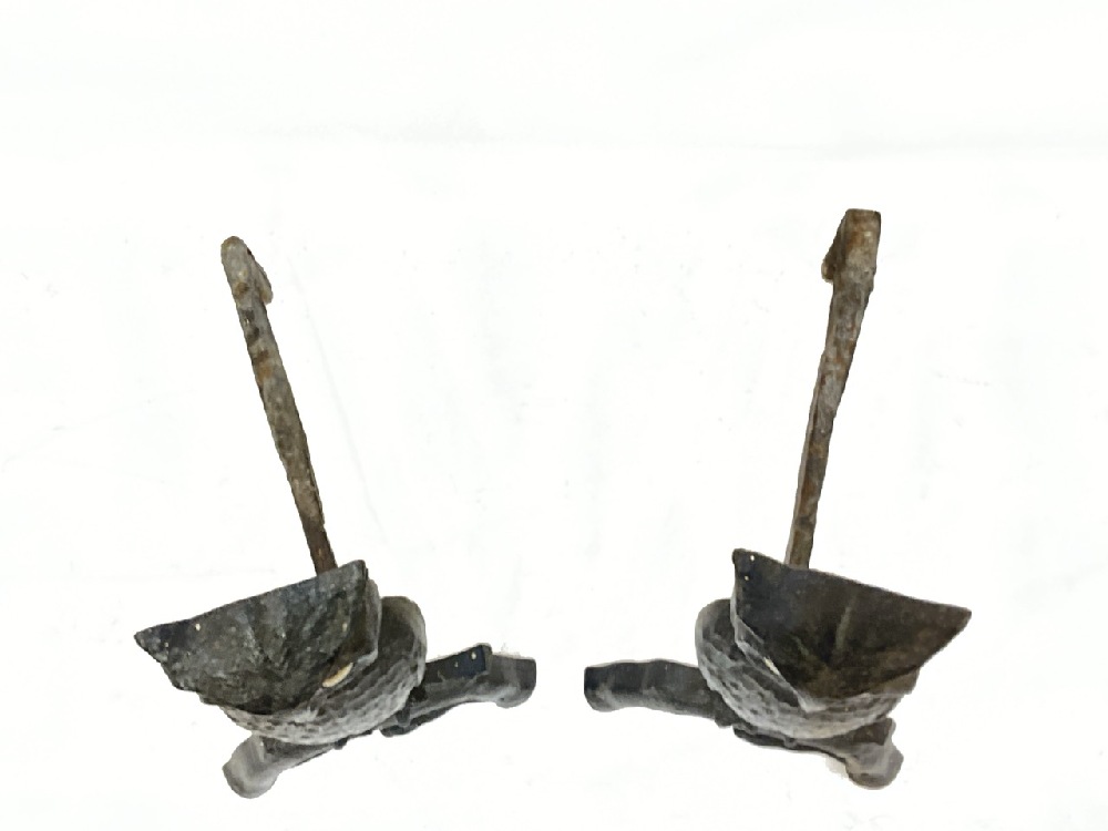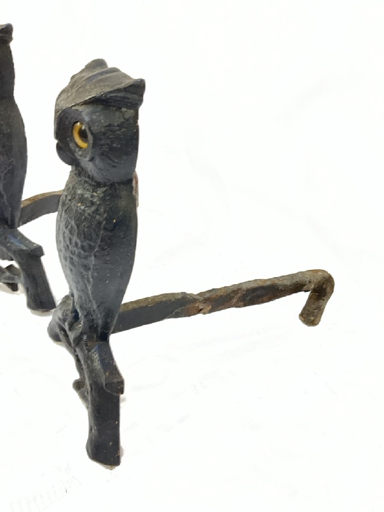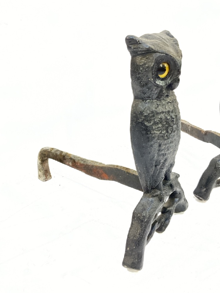 Antique Cast Iron Owl Andirons. With Original inset yellow marble glass eyes.